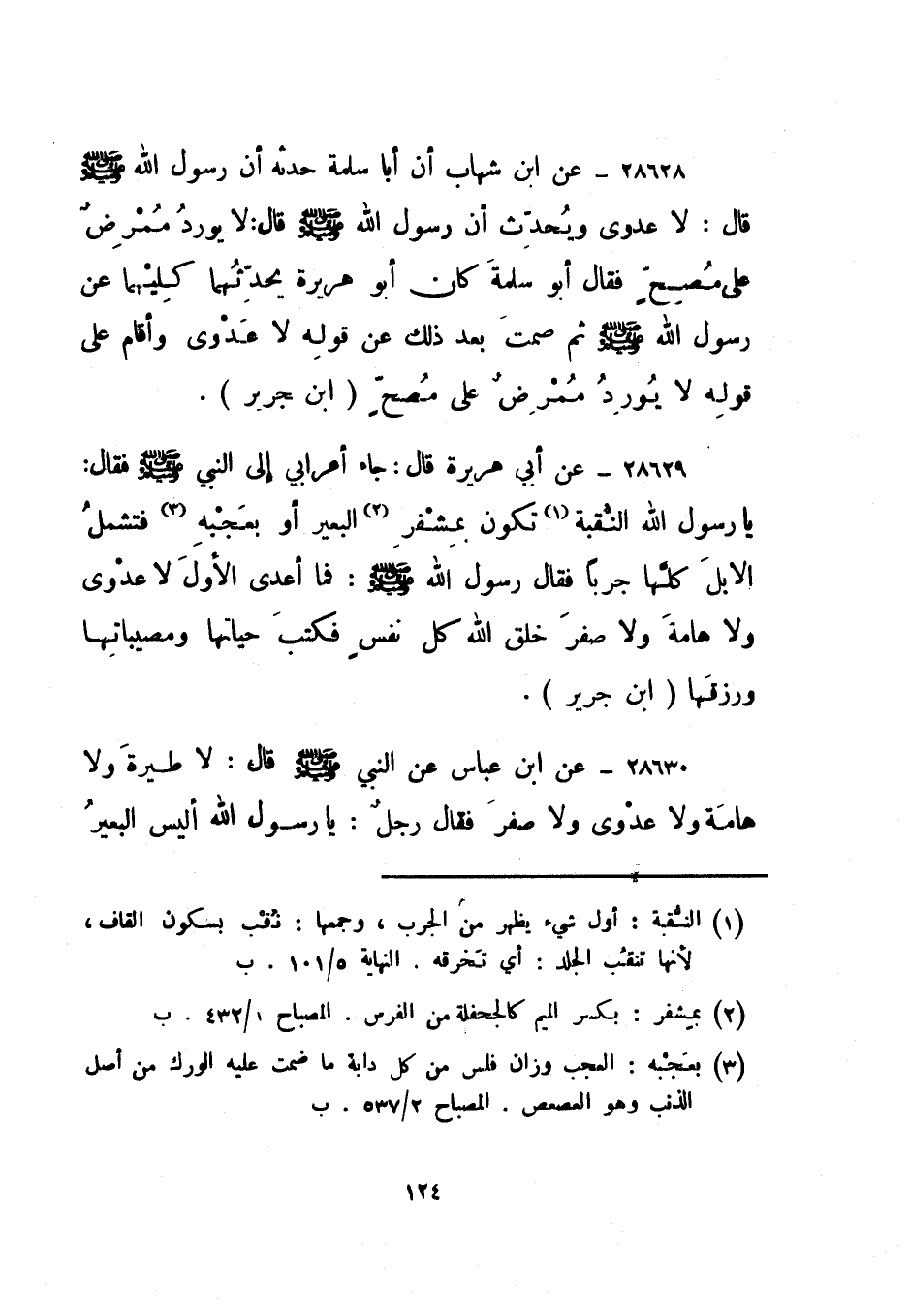 28629- عن أبي هريرة قال: جاء أعرابي إلى النبي صلى الله عليه وسلم فقال: يا رسول الله النقبة1 تكون بمشفر2 البعير أو بعجبه3 فتشمل الإبل كلها جربا فقال رسول الله صلى الله عليه وسلم: فما أعدى الأول لا عدوى ولا هامة ولا صفر خلق الله كل نفس فكتب حياتها ومصيباتها ورزقها. ابن جرير.