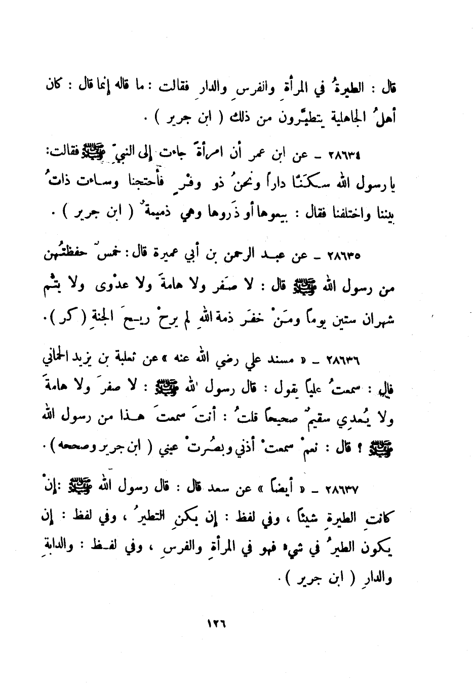 28637- "أيضا" عن سعد قال: قال رسول الله صلى الله عليه وسلم: "إن كانت الطيرة شيئا، وفي لفظ: إن يكن التطير، وفي لفظ: إن يكون الطير في شيء فهو في المرأة والفرس"، وفي لفظ: والدابة والدار. ابن جرير.