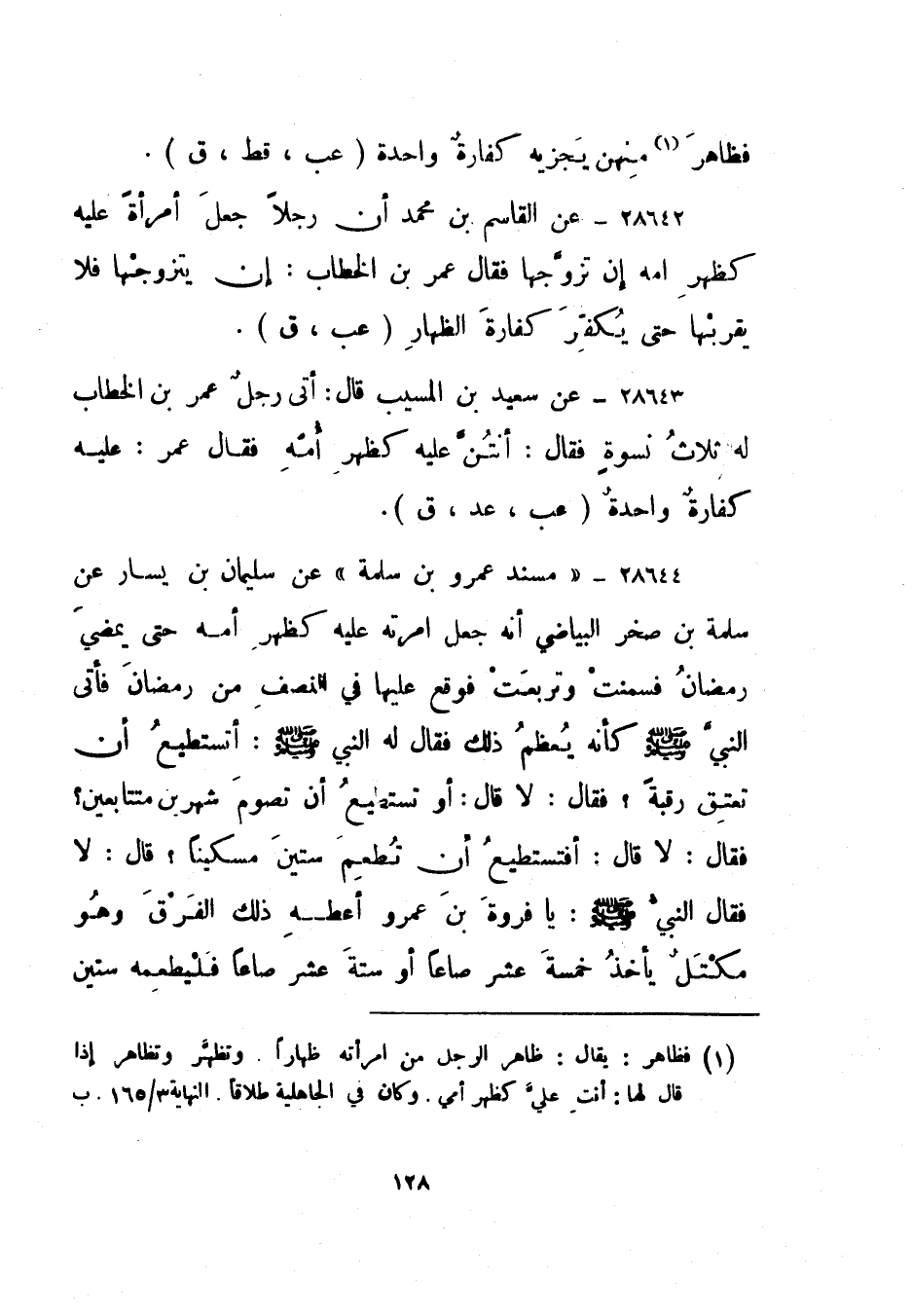 28643- عن سعيد بن المسيب قال: أتى رجل عمر بن الخطاب له ثلاث نسوة فقال: أنتن عليه كظهر أمه فقال عمر: عليه كفارة واحدة. "عب، عد، ق".