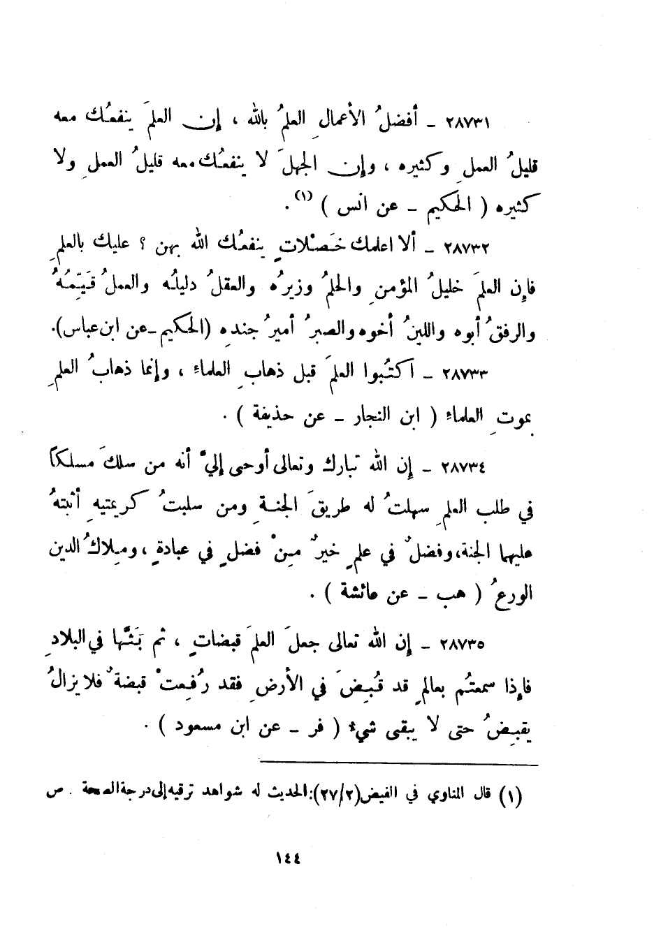 28731- "أفضل الأعمال العلم بالله، إن العلم ينفعك معه قليل العمل وكثيره، وإن الجهل لا ينفعك معه قليل العمل ولا كثيره". الحكيم - عن أنس1.