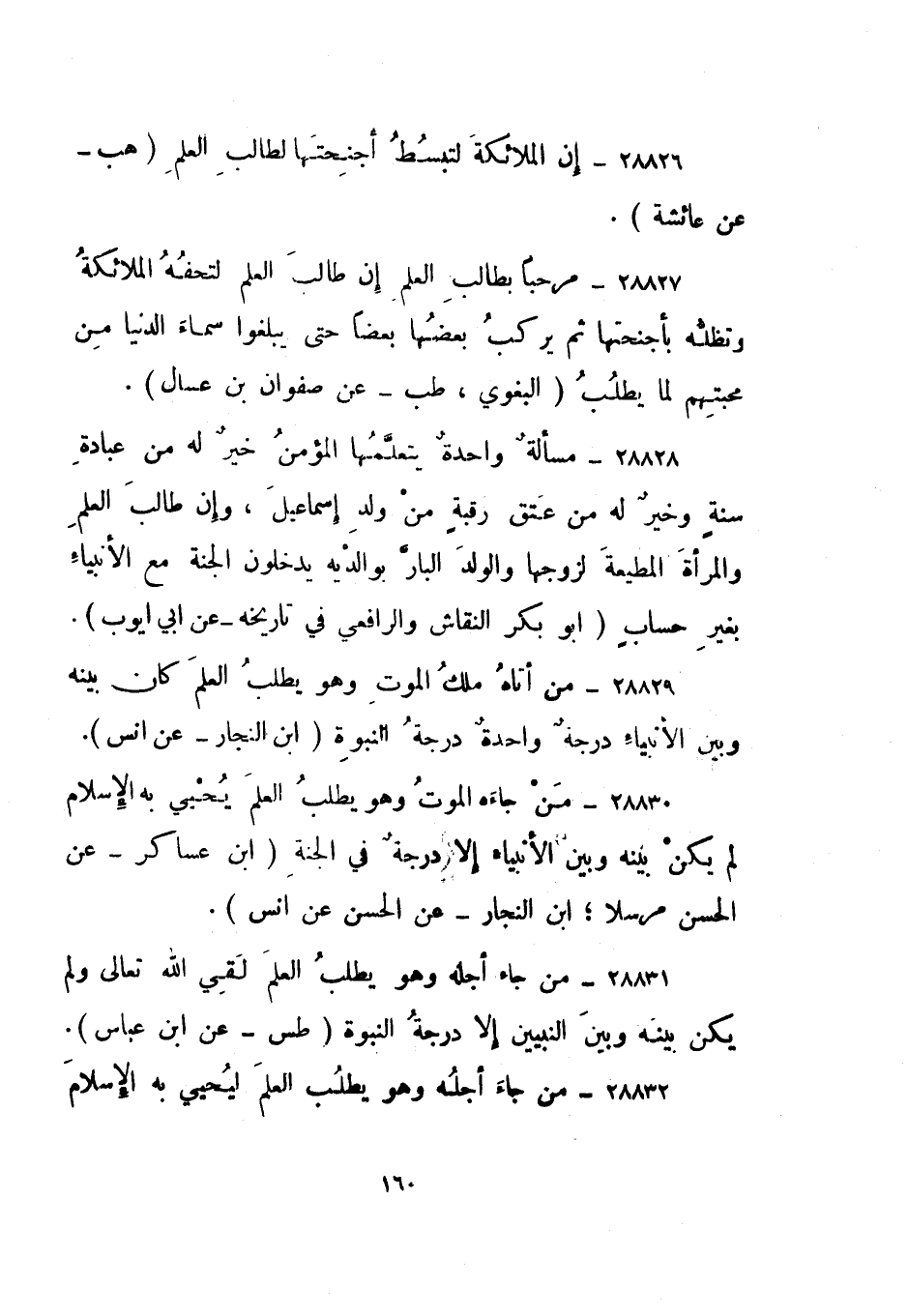 28826- "إن الملائكة لتبسط أجنحتها لطالب العلم". "هب" عن عائشة.