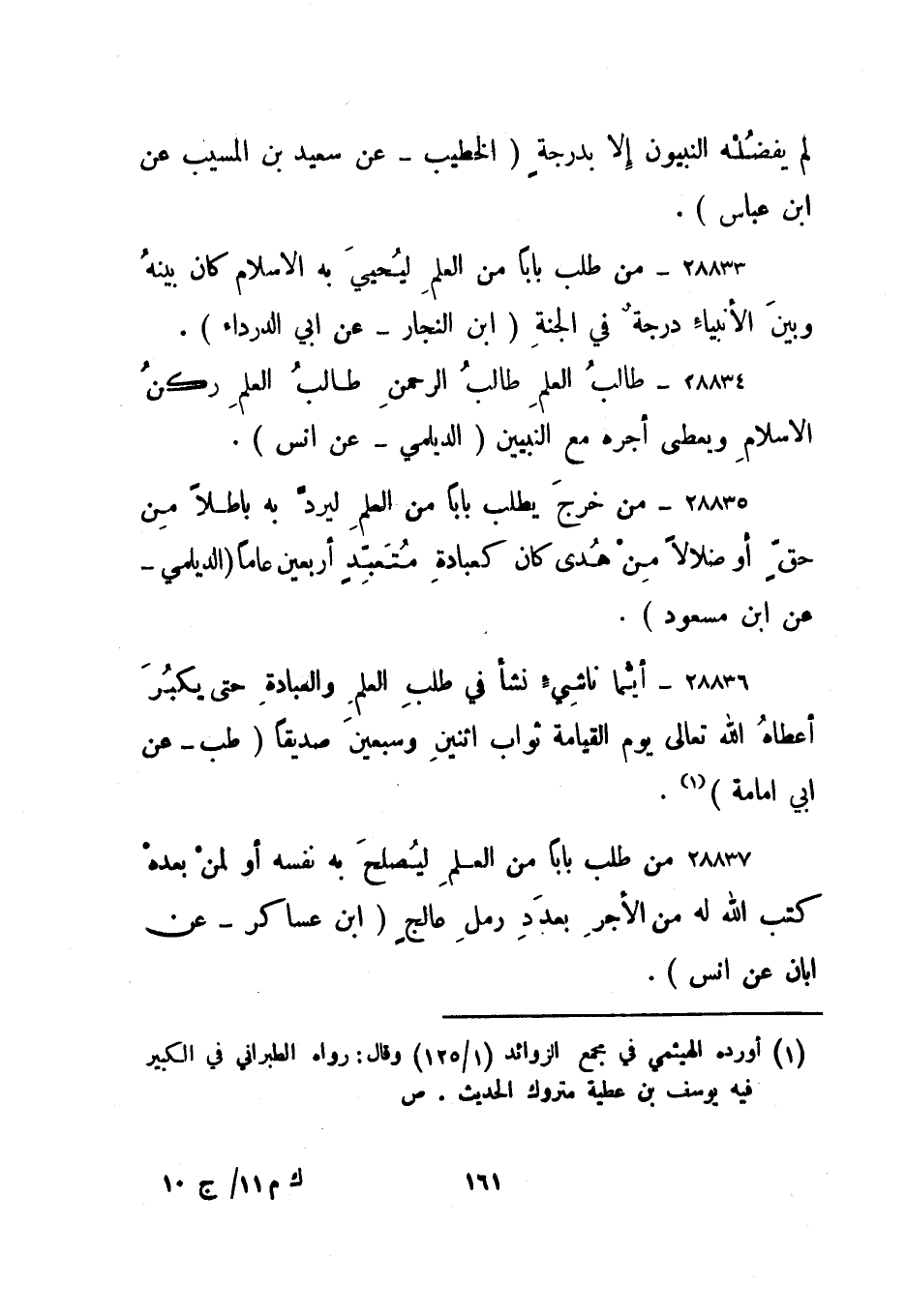 28835- "من خرج يطلب بابا من العلم ليرد به باطلا من حق أو ضلالا من هدى كان كعبادة متعبد أربعين عاما". الديلمي - عن ابن مسعود.
