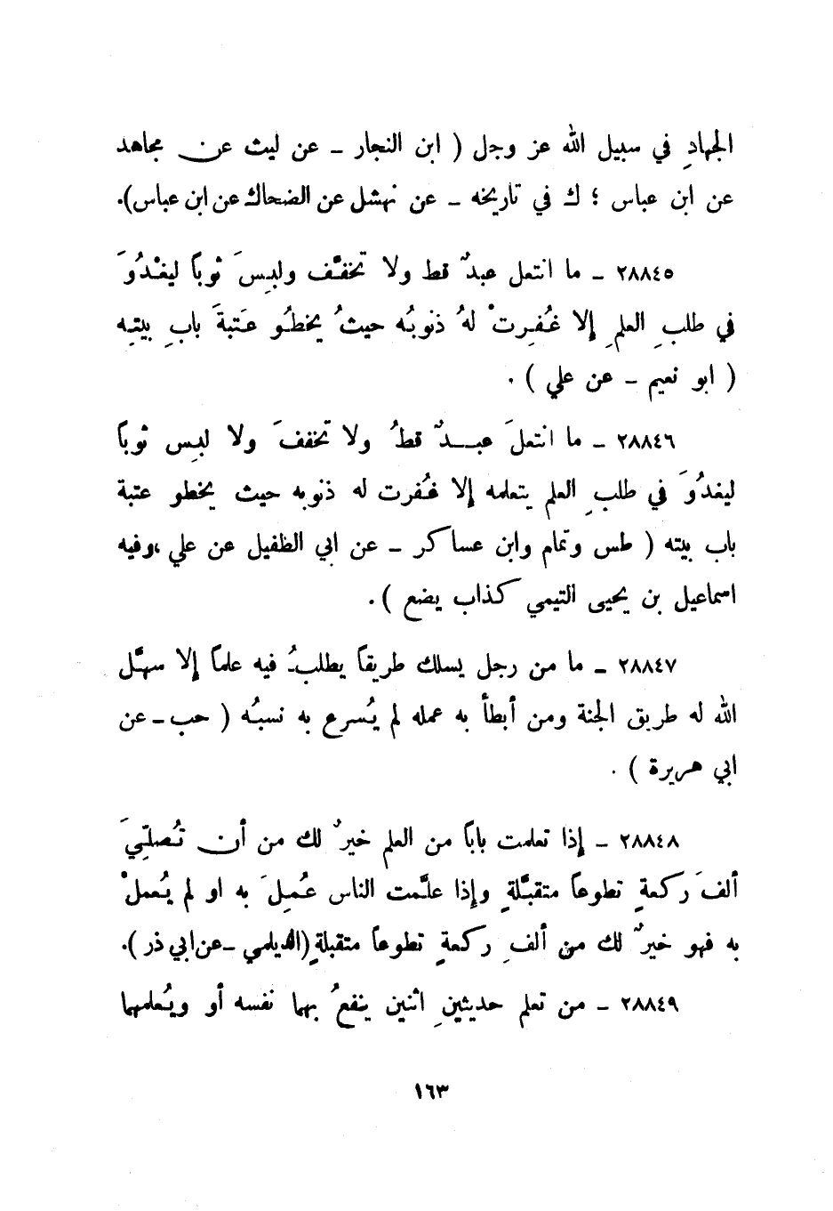 28845- " ما انتعل عبد قط ولا تخفف ولبس ثوبا ليغدو في طلب العلم إلا غفرت له ذنوبه حيث يخطو عتبة باب بيته". أبو نعيم - عن علي.