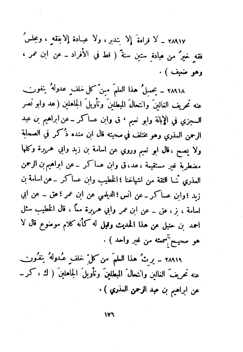 28918- "يحمل هذا العلم من كل خلف عدوله ينفون عنه تحريف الغالين وانتحال المبطلين وتأويل الجاهلين". "عد" وأبو نصر السجزي في الإبانة وأبو نعيم، "ق" وابن عساكر - عن إبراهيم بن عبد الرحمن العذري وهو مختلف في صحبته قال ابن منده ذكر في الصحابة ولا يصح، قال أبو نعيم وروي عن أسامة بن زيد وأبي هريرة وكلها مضطربة غير مستقيمة، "عد، ق" وابن عساكر - عن إبرهيم بن عبد الرحمن العذري ثنا الثقة من أشياخنا؛ الخطيب وابن عساكر - عن أسامة بن زيد؛ وابن عساكر - عن أنس؛ الديلمي عن ابن عمر؛ "عق" عن أبي أسامة، "بز، عق" عن ابن عمر وأبي هريرة معا، قال الخطيب سئل أحمد بن حنبل عن هذا الحديث وقيل له كأنه كلام موضوع قال لا هو صحيح سمعته من غير واحد.