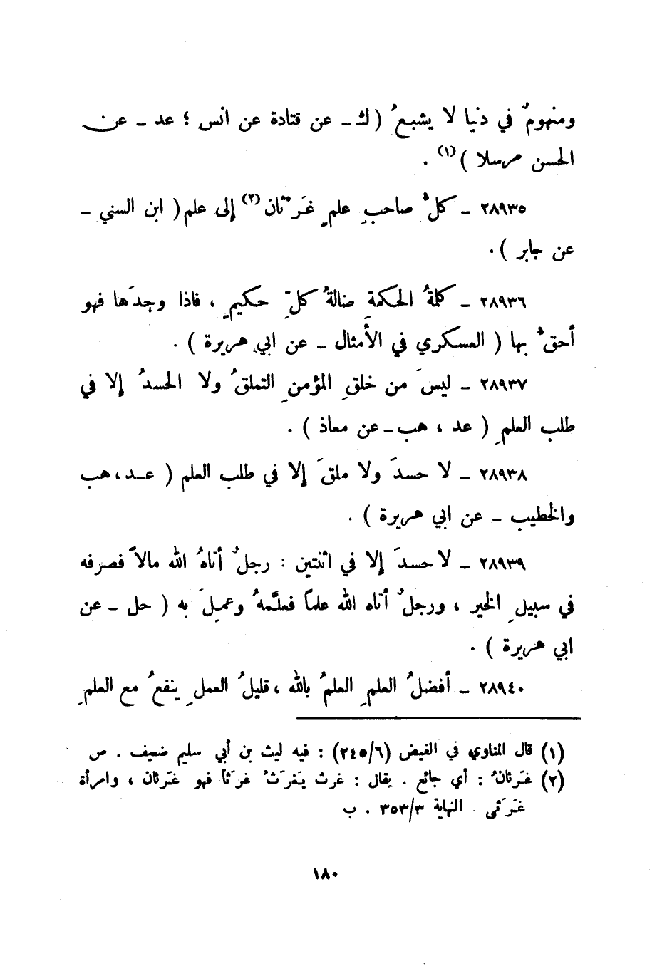 28938- " لا حسد ولا ملق إلا في طلب العلم". "عد، هب" والخطيب - عن أبي هريرة.