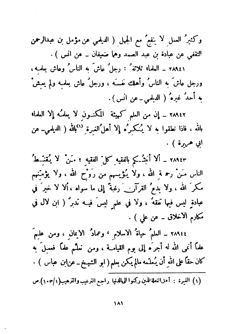 28943- "ألا أنبئكم بالفقيه كل الفقيه؟ من لا يقنط الناس من رحمة الله، ولا يؤيسهم من روح الله، ولا يؤمنهم مكر الله، ولا يدع القرآن رغبة إلى ما سواه، ألا لا خير في عبادة ليس فيها تفقه، ولا في علم ليس فيه تدبر". ابن لال في مكارم الأخلاق - عن علي.