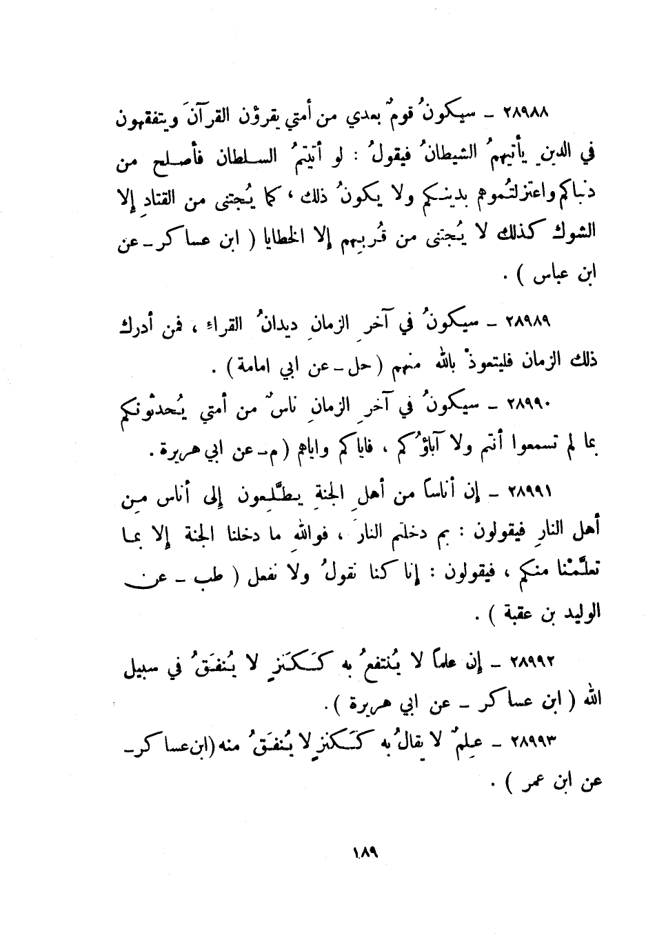 28988- "سيكون قوم بعدي من أمتي يقرؤون القرآن ويتفقهون في الدين يأتيهم الشيطان فيقول: لو أتيتم السلطان فأصلح من دنياكم واعتزلتموهم بدينكم ولا يكون ذلك، كما يجتنى من القتاد إلا الشوك كذلك لا يجتنى من قربهم إلا الخطايا. ابن عساكر - عن ابن عباس.