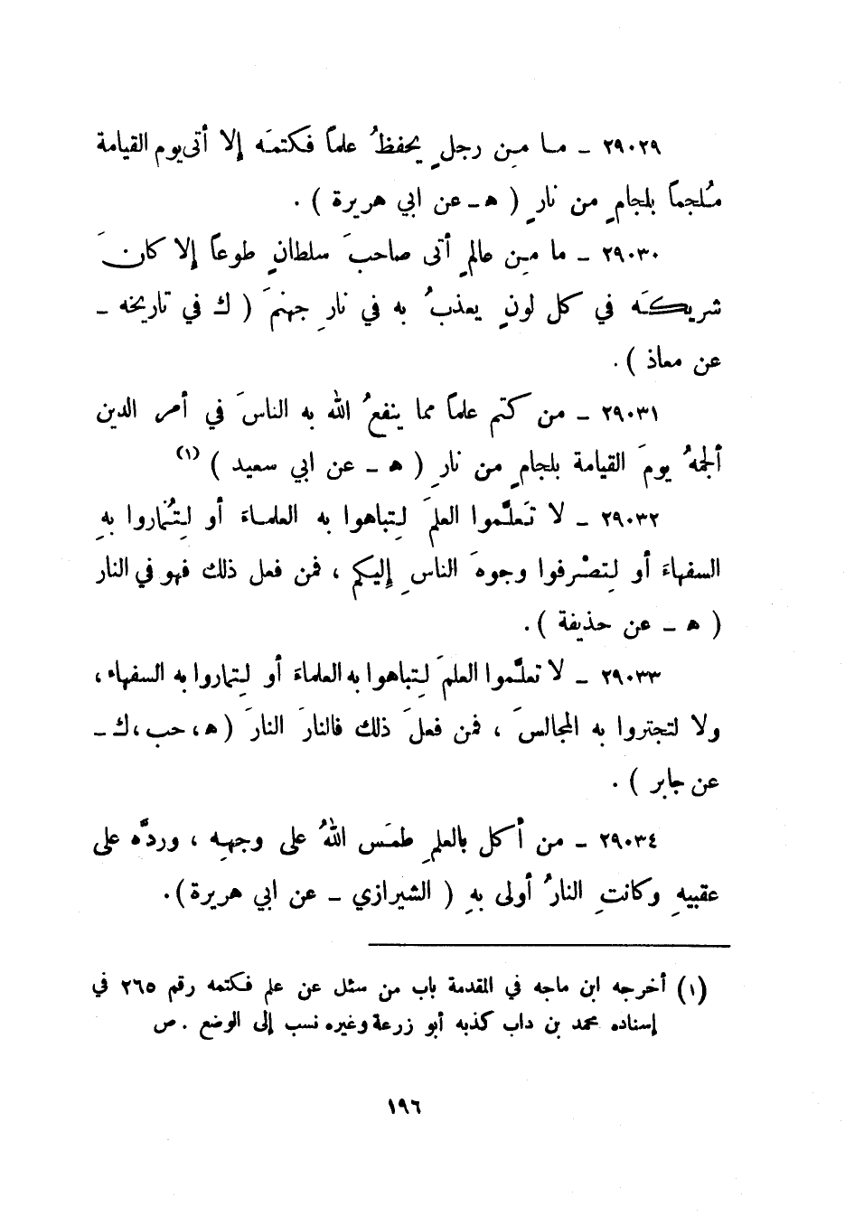 29031- "من كتم علما مما ينفع الله به الناس في أمر الدين ألجمه يوم القيامة بلجام من نار. "هـ" عن أبي سعيد1.