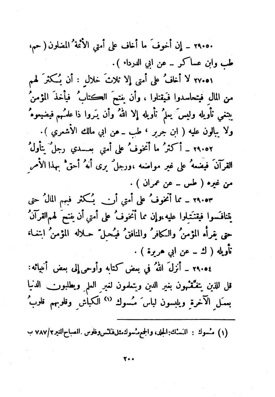 29052- "أكثر ما أتخوف على أمتي بعدي رجل يتأول القرآن فيضعه على غير مواضعه، ورجل يرى أنه أحق بهذا الأمر من غيره. "طس" عن عمران.