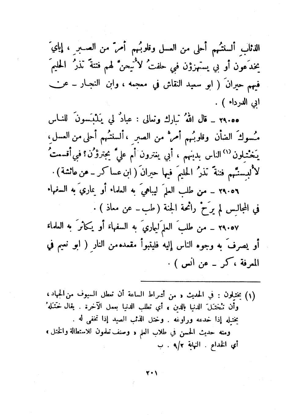 29057- "من طلب العلم ليماري به السفهاء أو يكاثر به العلماء أو يصرف به وجوه الناس إليه فليتبوأ مقعده من النار". أبو نعيم في المعرفة، "كر" عن أنس.
