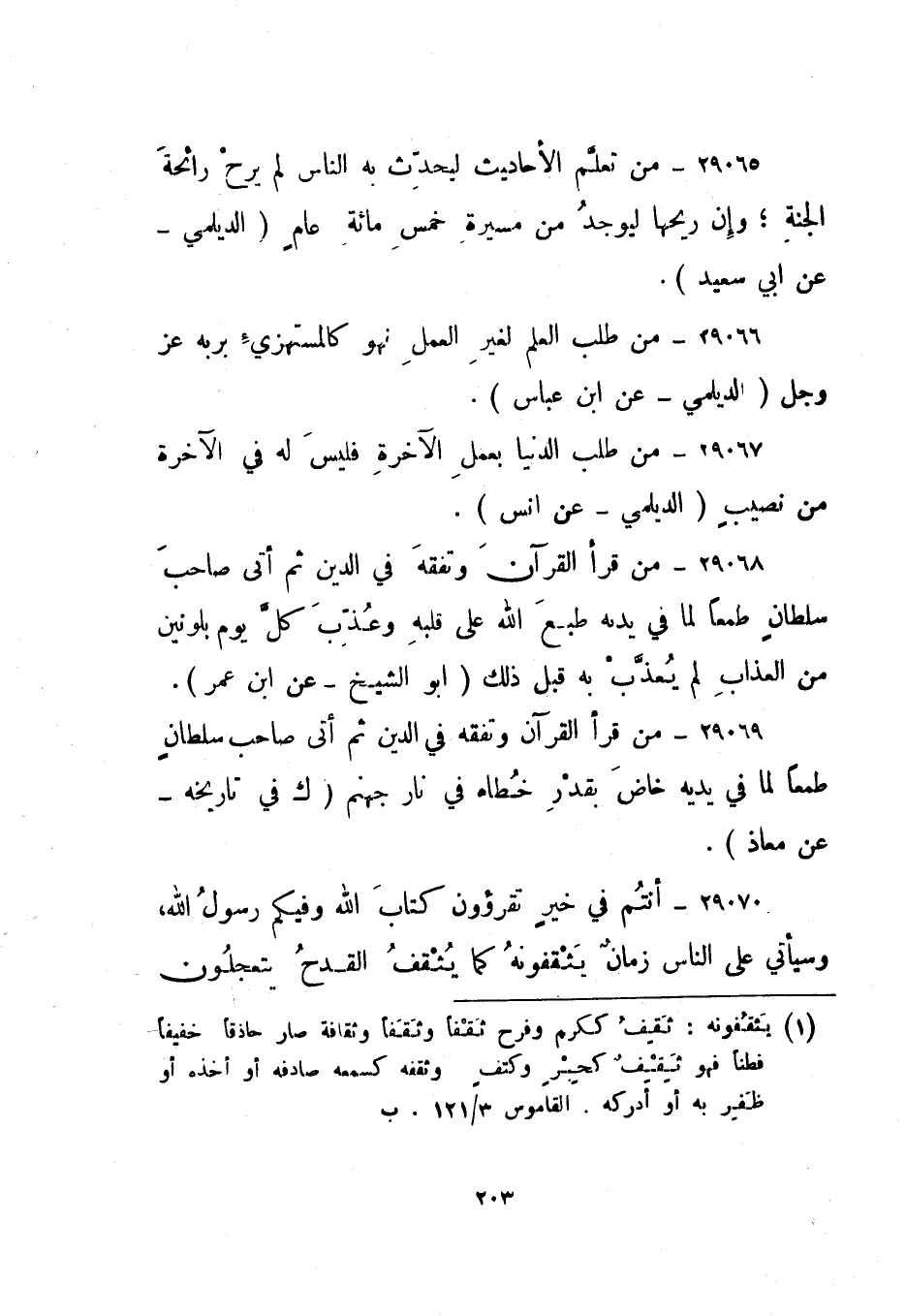 29065- "من تعلم الأحاديث ليحدث به الناس لم يرح رائحة الجنة؛ وإن ريحها ليوجد من مسيرة خمس مائة عام". الديلمي - عن أبي سعيد.