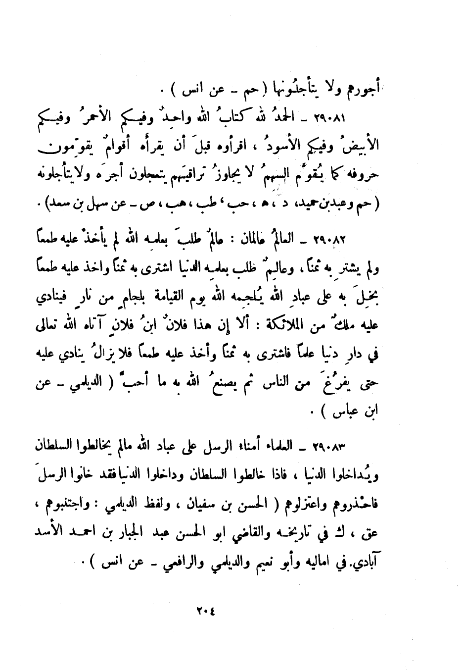 29083- "العلماء أمناء الرسل على عباد الله ما لم يخالطوا السلطان ويداخلوا الدنيا، فإذا خالطوا السلطان وداخلوا الدنيا فقد خانوا الرسل فاحذروهم واعتزلوهم". الحسن بن سفيان، ولفظ الديلمي: واجتنبوهم، "عق، ك" في تاريخه والقاضي أبو الحسن عبد الجبار بن أحمد الأسد آبادي في أماليه وأبو نعيم والديلمي والرافعي - عن أنس.