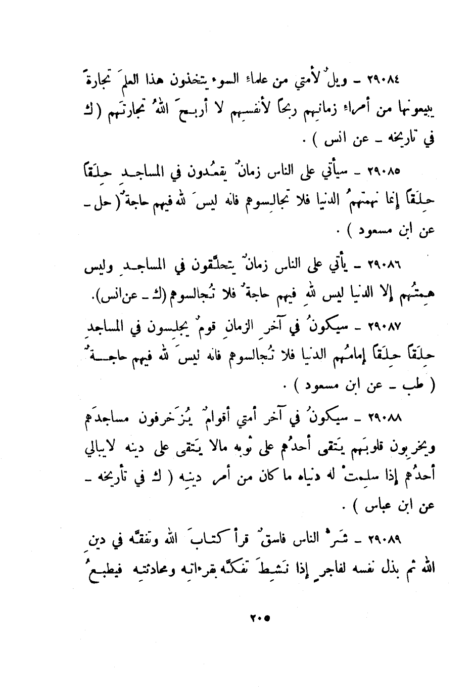 29085- "سيأتي على الناس زمان يقعدون في المساجد حلقا حلقا إنما نهمتهم الدنيا فلا تجالسوهم فإنه ليس لله فيهم حاجة". "حل" - عن ابن مسعود.