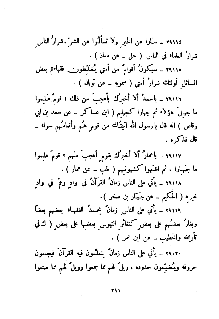 29120- "يأتي على الناس زمان يتعلمون فيه القرآن فيجمعون حروفه ويضيعون حدوده، ويل لهم مما جمعوا وويل لهم مما صنعوا