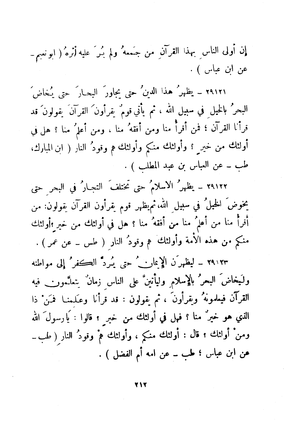 29122- " يظهر الإسلام حتى تختلف التجار في البحر حتى يخوض الخيل في سبيل الله، ثم يظهر قوم يقرأون القرآن يقولون: من أقرأ منا من أعلم منا من أفقه منا؟ هل في أولئك من خير؟ أولئك منكم، من هذه الأمة وأولئك هم وقود النار". "طس" عن عمر.