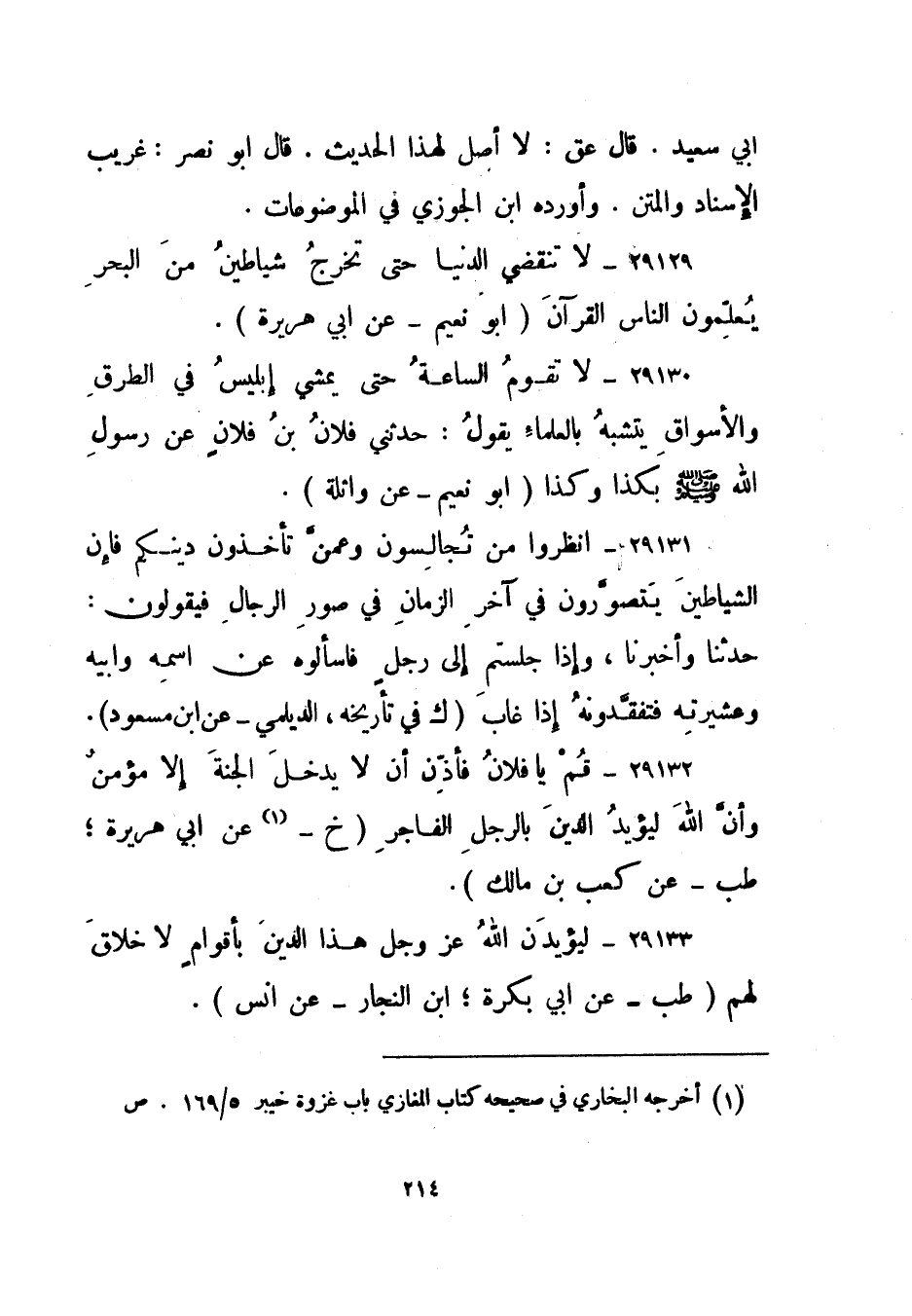 29129- "لا تنقضي الدنيا حتى تخرج شياطين من البحر يعلمون الناس القرآن". أبو نعيم - عن أبي هريرة.