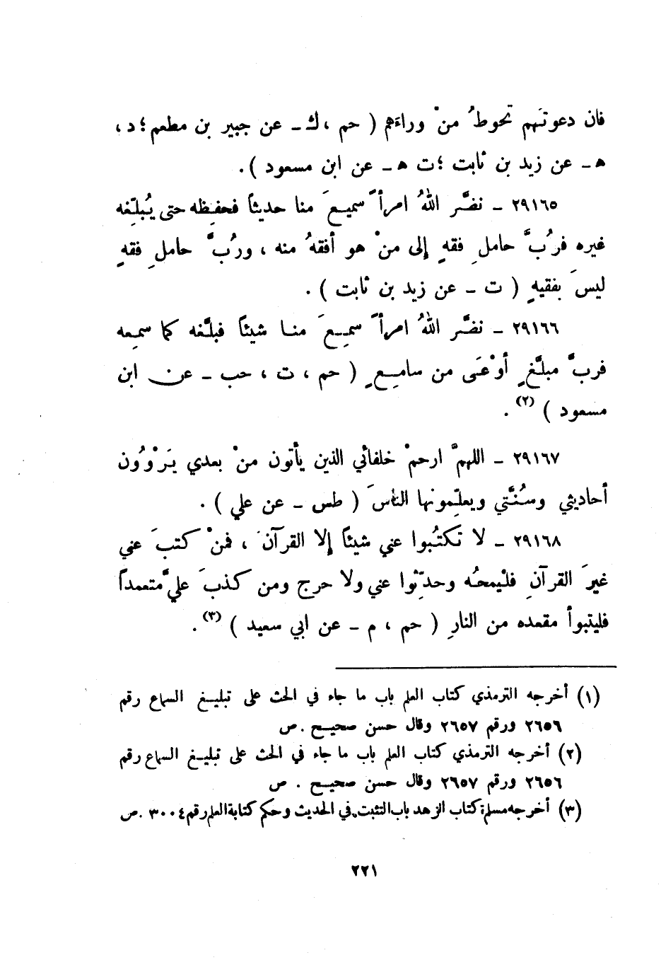 29165- "نضر الله امرأ سمع منا حديثا فحفظه حتى يبلغه غيره فرب حامل فقه إلى من هو أفقه منه، ورب حامل فقه ليس بفقيه". "ت" عن زيد بن ثابت.1