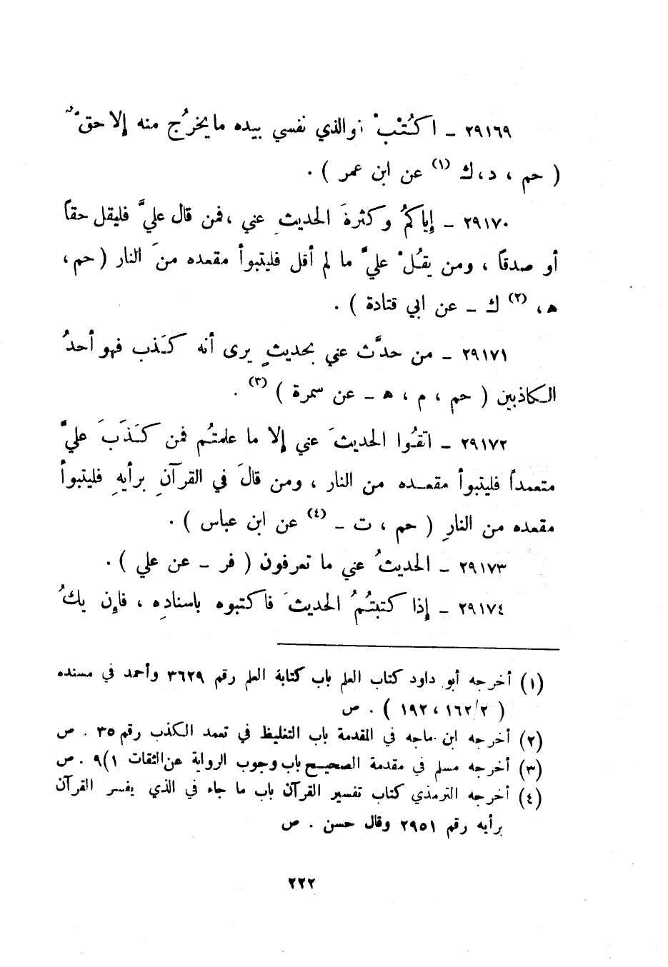 29172- "اتقوا الحديث عني إلا ما علمتم فمن كذب علي متعمدا فليتبوأ مقعده من النار، ومن قال في القرآن برأيه فليتبوأ مقعده من النار". "حم، ت"4 عن ابن عباس.