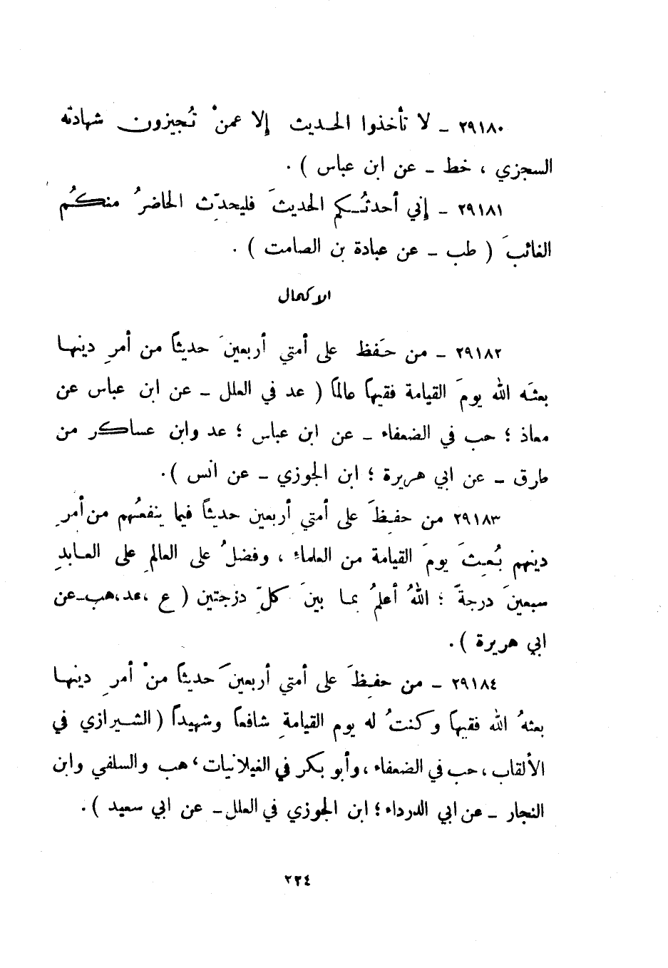 29184- "من حفظ على أمتي أربعين حديثا من أمر دينها بعثه الله فقيها وكنت له يوم القيامة شافعا وشهيدا". الشيرازي في الألقاب، "حب" في الضعفاء، وأبو بكر في الغيلانيات، "هب" والسلفي وابن النجار - عن أبي الدرداء؛ ابن الجوزي في العلل - عن أبي سعيد.