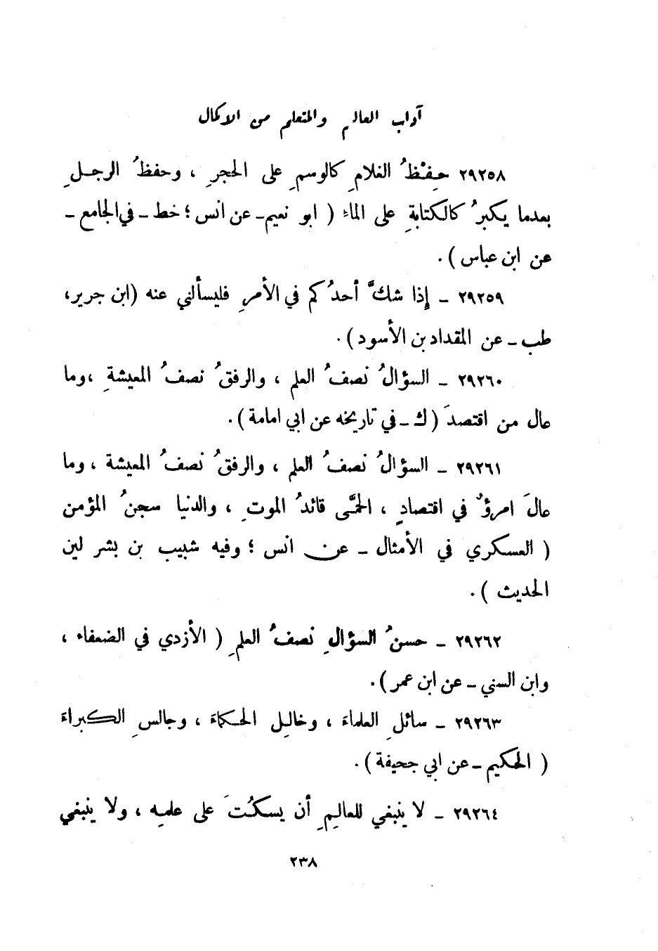 29262- "حسن السؤال نصف العلم". الأزدي في الضعفاء، وابن السني - عن ابن عمر.