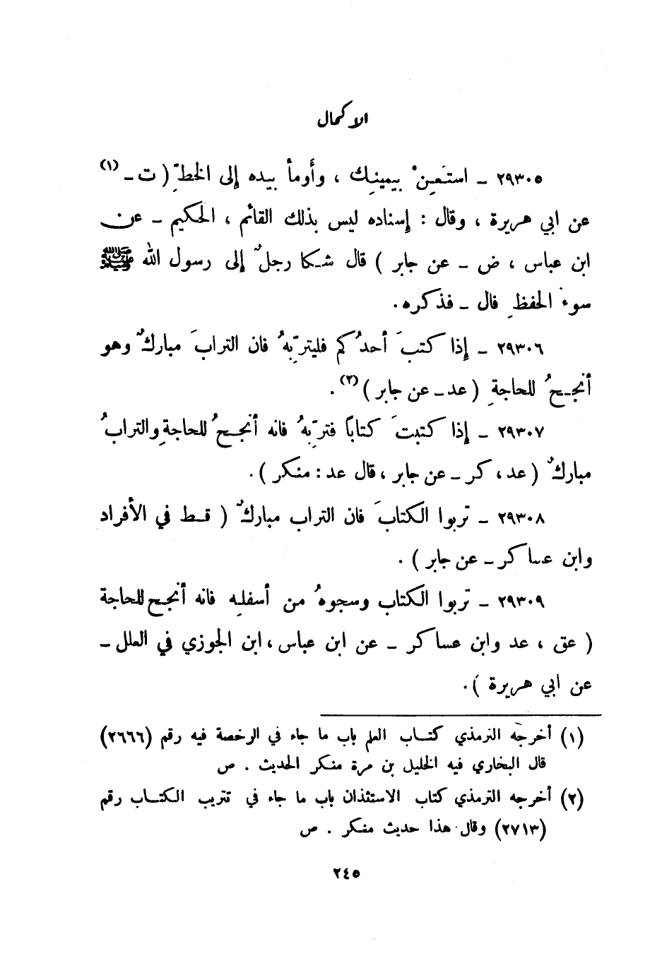 2 أخرجه الترمذي كتاب الاستئذان باب ما جاء في تتريب الكتاب رقم "2713" وقال هذا حديث منكر. ص.