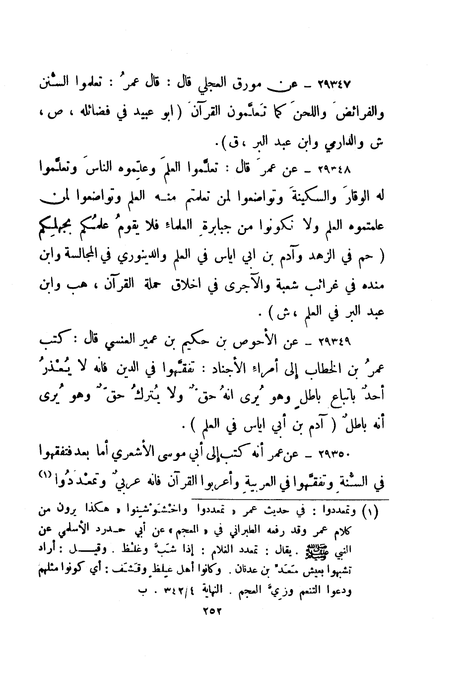 29347- عن مورق العجلي قال: قال عمر: تعلموا السنن والفرائض واللحن كما تعلمون القرآن. أبو عبيد في فضائله، "ص، ش" والدارمي وابن عبد البر، "ق".