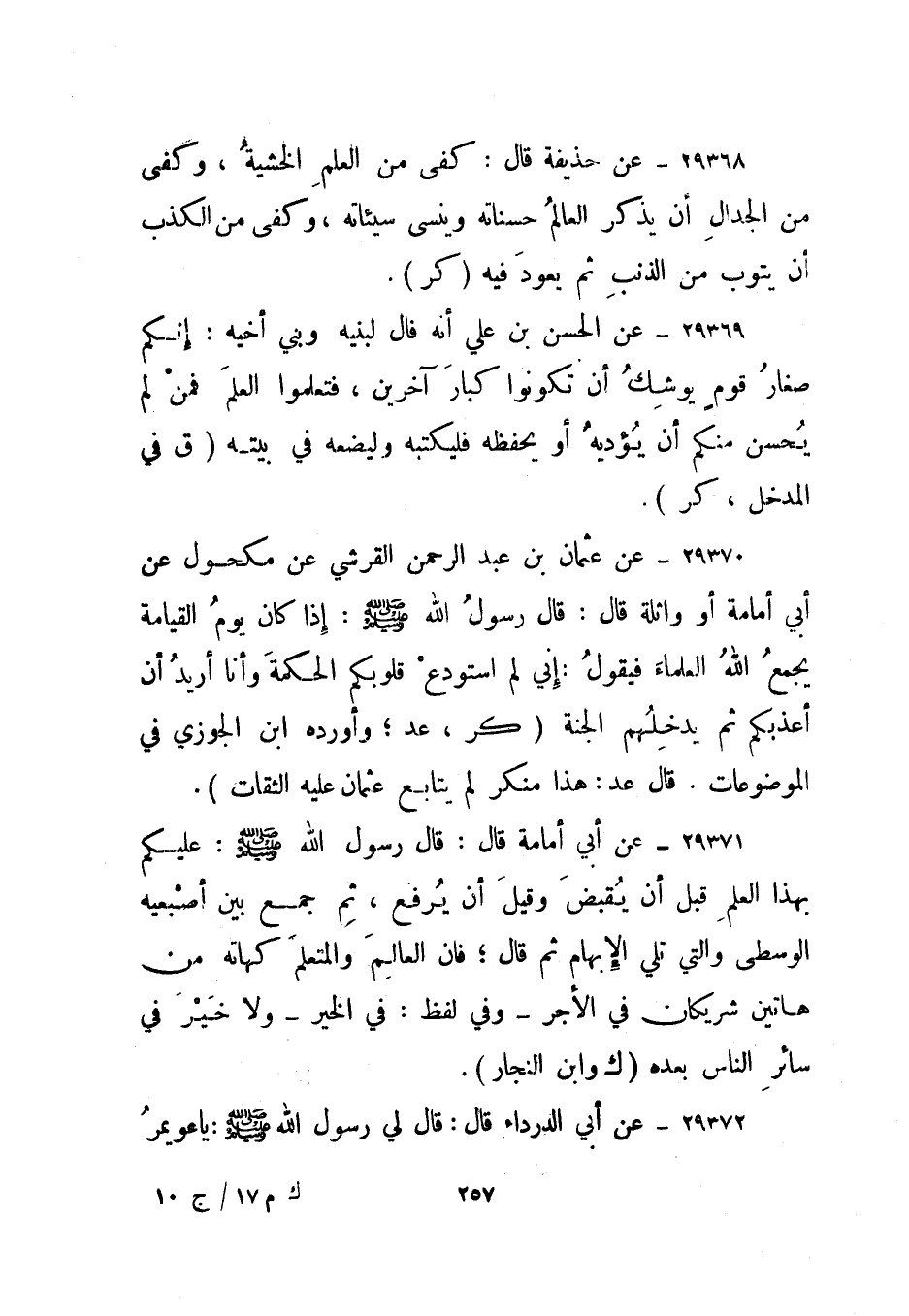 29368- عن حذيفة قال: كفى من العلم الخشية، وكفى من الجدال أن يذكر العالم حسناته وينسى سيئاته، وكفى من الكذب أن يتوب من الذنب ثم يعود فيه. "كر".