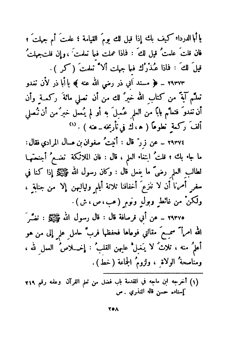 29373- "مسند أبي ذر رضي الله عنه" " يا أبا ذر لأن تغدو تعلم آية من كتاب الله خير لك من أن تصلي مائة ركعة وأن أن تغدو فتعلم بابا من العلم عمل به أو لم يعمل خير من أن تصلي ألف ركعة تطوعا". "هـ، ك" في تأريخه - عنه1.