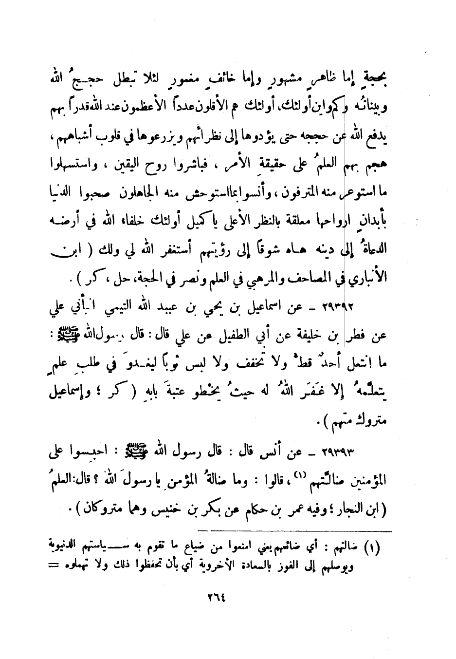 29393- عن أنس قال: قال رسول الله صلى الله عليه وسلم: "احبسوا على المؤمنين ضالتهم1 قالوا: وما ضالة المؤمن يا رسول الله؟ قال: العلم". ابن النجار؛ وفيه عمر بن حكام عن بكر بن خنيس وهما متروكان.
