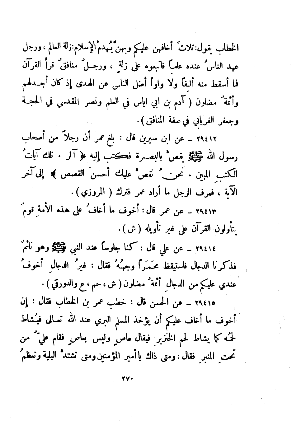29413- عن عمر قال: أخوف ما أخاف على هذه الأمة قوم يتأولون القرآن على غير تأويله. "ش".