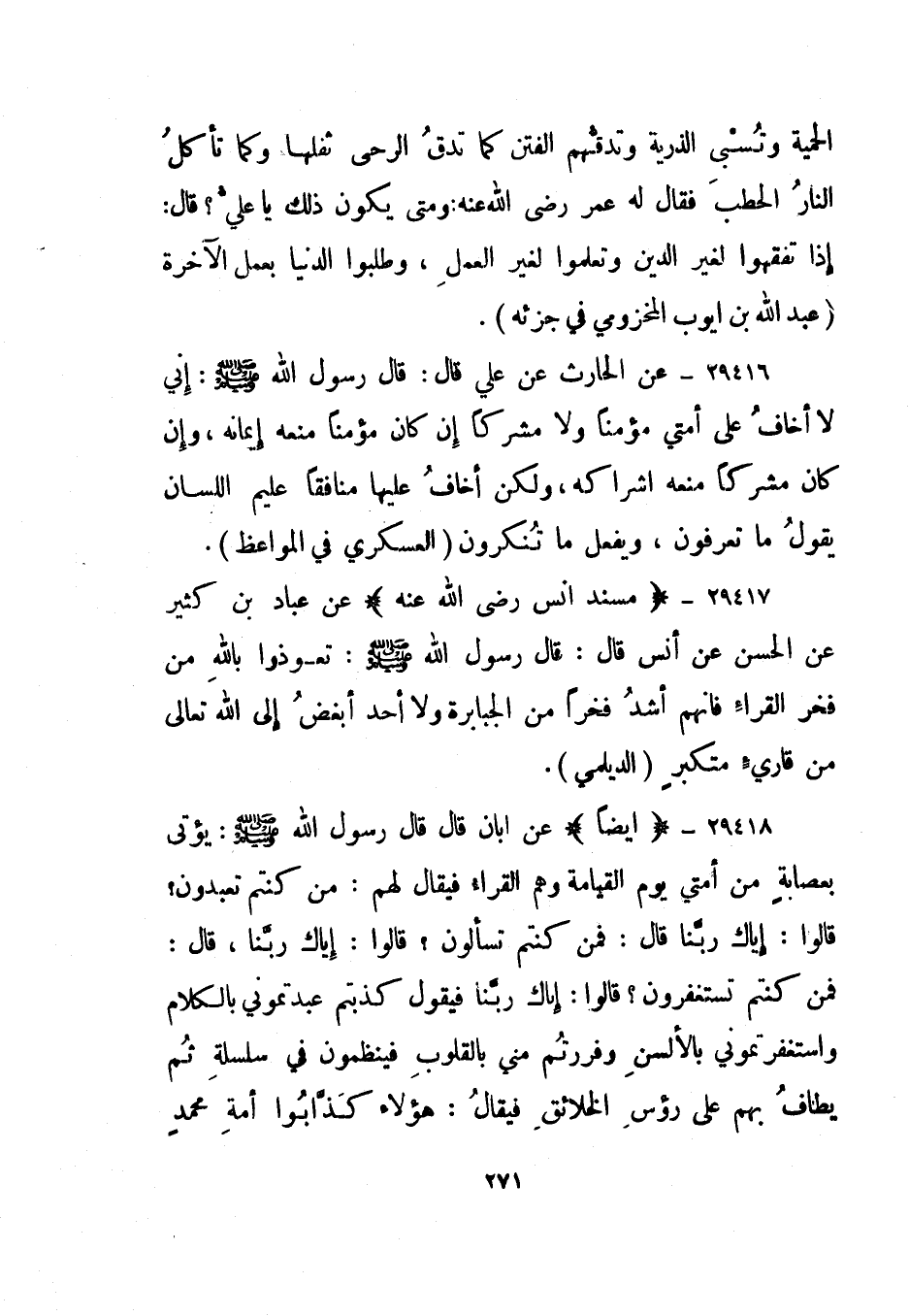 29417- "مسند أنس رضي الله عنه" عن عباد بن كثير عن الحسن عن أنس قال: قال رسول الله صلى الله عليه وسلم: "تعوذوا بالله من فخر القراء فإنهم أشد فخرا من الجبابرة ولا أحد أبغض إلى الله تعالى من قاريء متكبر". الديلمي.