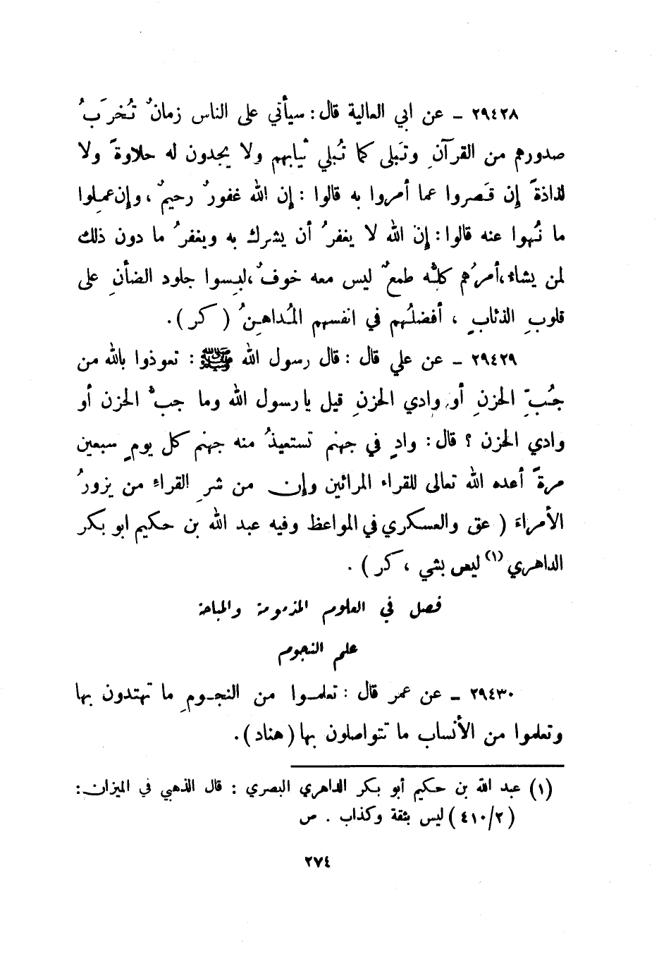 29430- عن عمر قال: تعلموا من النجوم ما تهتدون بها وتعلموا من الأنساب ما تتواصلون بها. هناد.