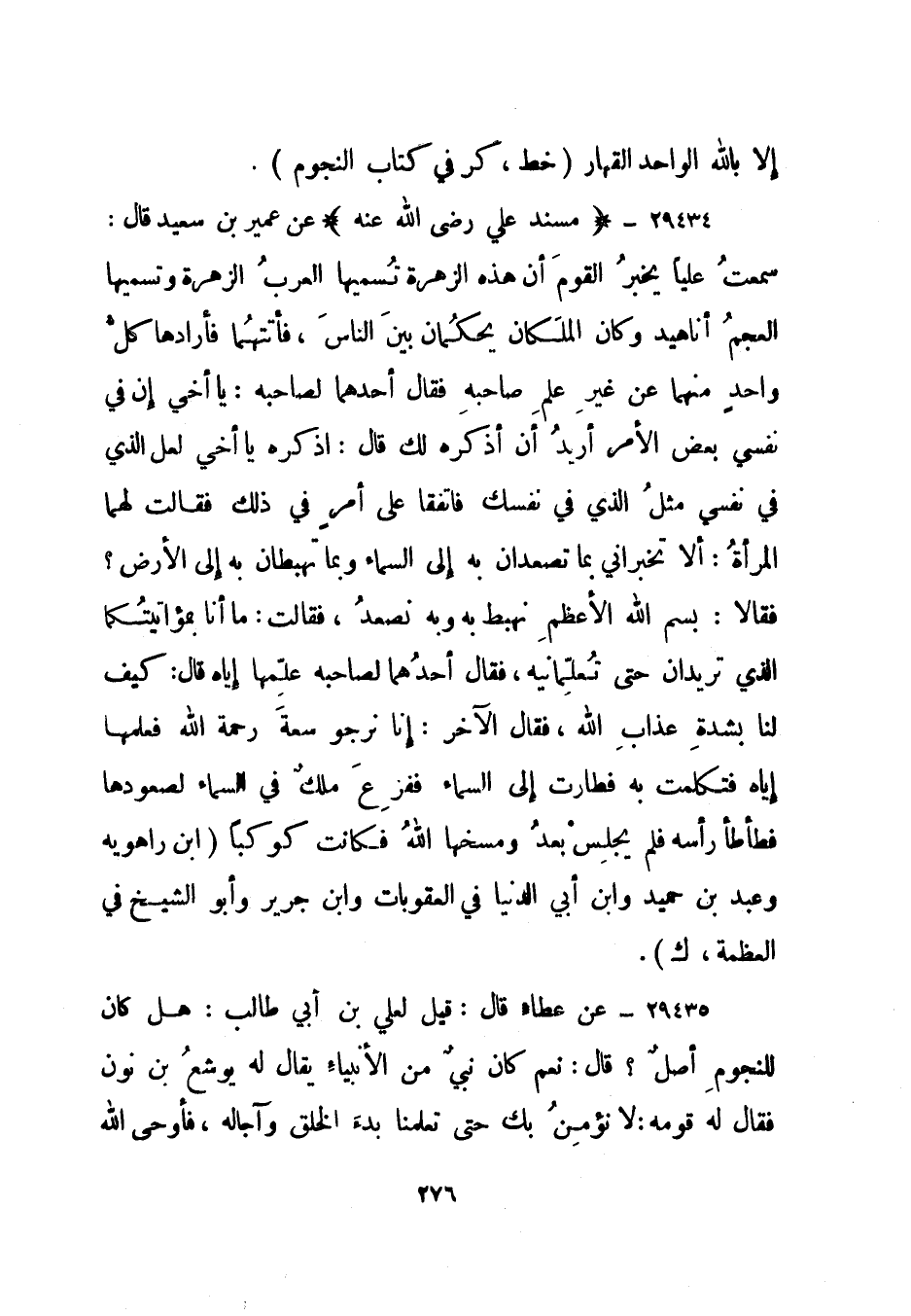29435- عن عطاء قال: قيل لعلي بن أبي طالب: هل كان للنجوم أصل؟ قال: نعم كان نبي من الأنبياء يقال له يوشع بن نون فقال له قومه: لا نؤمن بك حتى تعلمنا بدء الخلق وآجاله، فأوحى الله