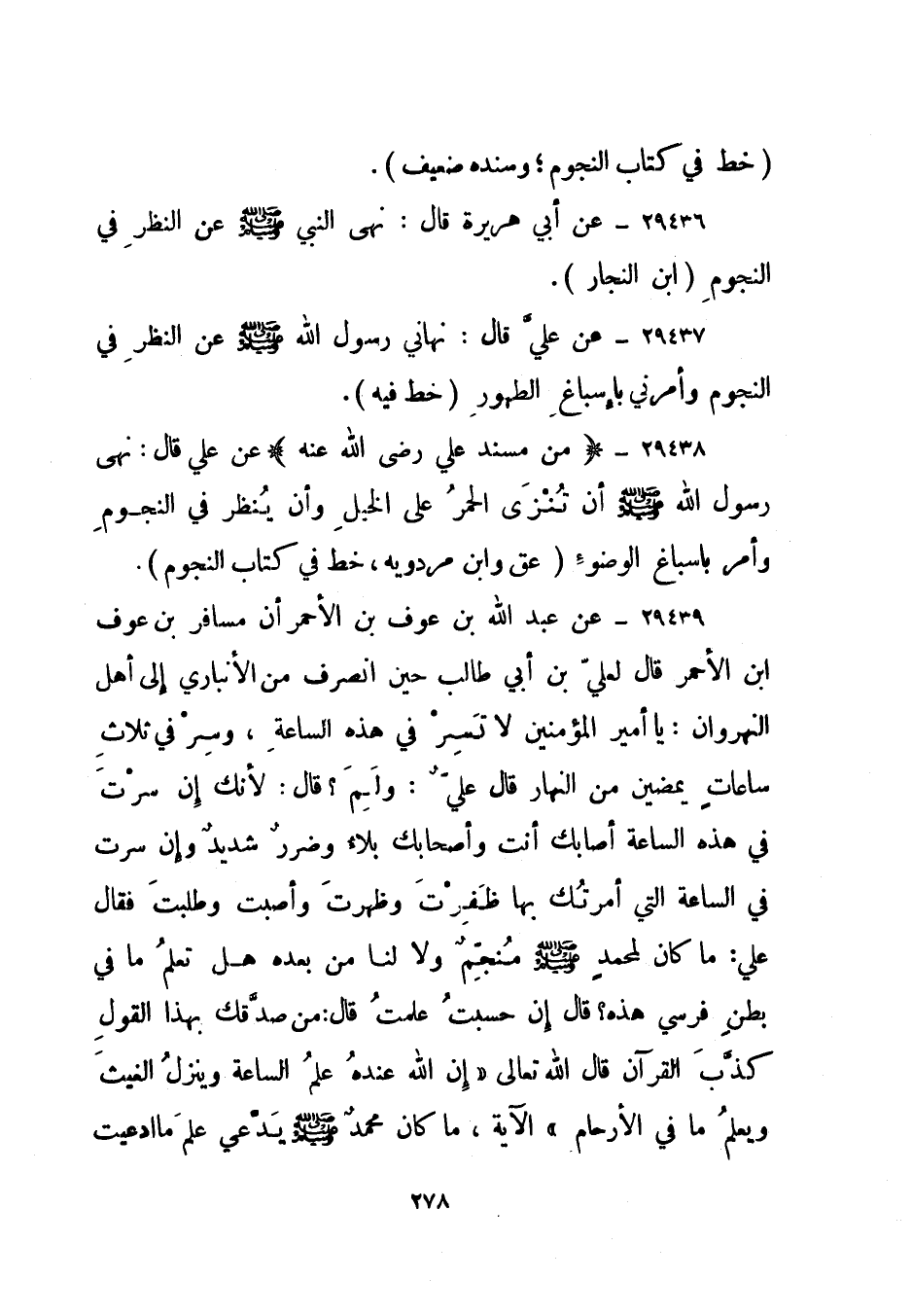 29437- عن علي قال: "نهاني رسول الله صلى الله عليه وسلم عن النظر في النجوم وأمرني بإسباغ الطهور. "خط" فيه.