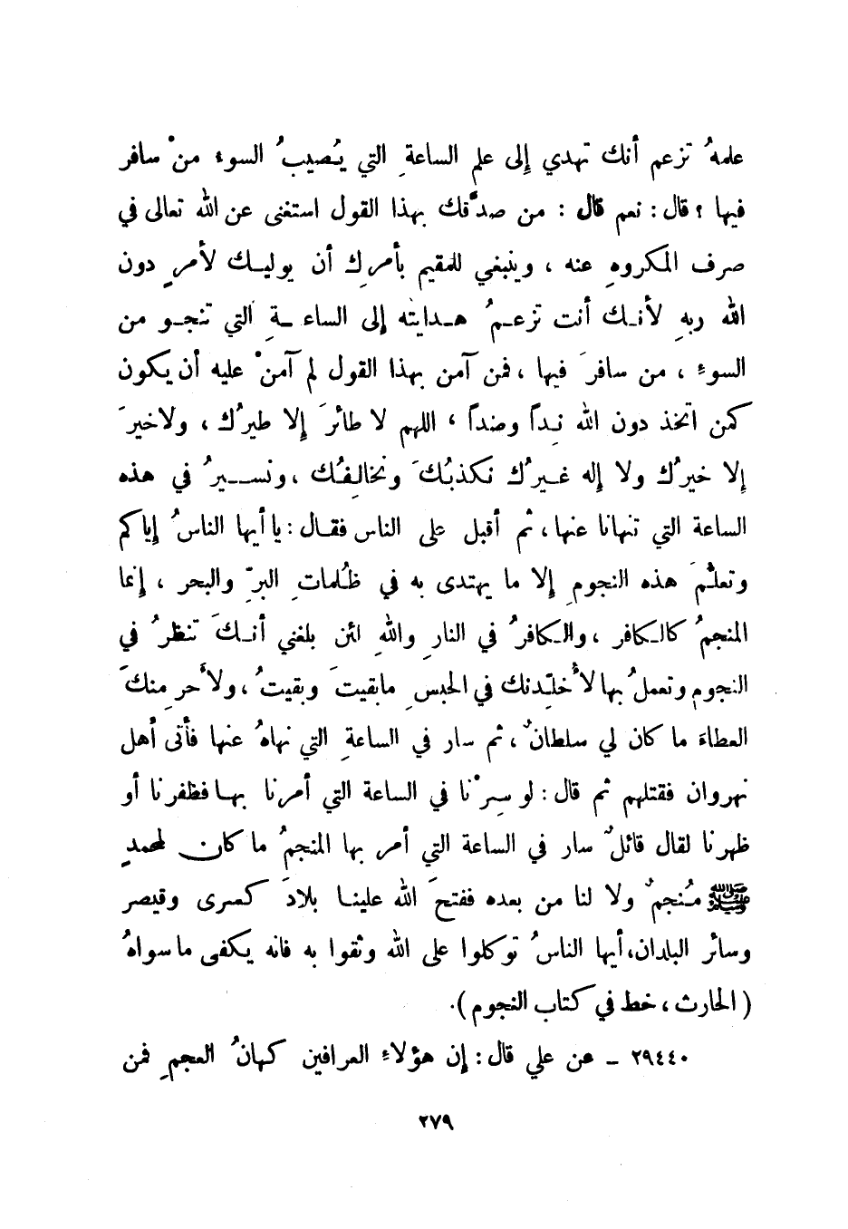 علمه تزعم أنك تهدي إلى علم الساعة التي يصيب السوء من سافر فيها؟ قال: نعم قال: من صدقك بهذا القول استغنى عن الله تعالى في صرف المكروه عنه، وينبغي للمقيم بأمرك أن يوليك لأمر دون الله ربه لأنك أنت تزعم هدايته إلى الساعة التي تنجو من السوء، من سافر فيها، فمن آمن بهذا القول لم آمن عليه أن يكون كمن اتخذ دون الله ندا وضدا، اللهم لا طائر إلا طيرك، ولا خير إلا خيرك ولا إله غيرك نكذبك ونخالفك، ونسير في هذه الساعة التي تنهانا عنها، ثم أقبل على الناس فقال: يا أيها الناس إياكم وتعلم هذه النجوم إلا ما يهتدى به في ظلمات البر والبحر، إنما المنجم كالكافر، والكافر في النار والله لئن بلغني أنك تنظر في النجوم وتعمل بها لأخلدنك في الحبس ما بقيت وبقيت، ولأحرمنك العطاء ما كان لي سلطان، ثم سار في الساعة التي نهاه عنها فأتى أهل نهروان فقتلهم ثم قال: لو سرنا في الساعة التي أمرنا بها فظفرنا أو ظهرنا لقال قائل سار في الساعة التي أمر بها المنجم ما كان لمحمد صلى الله عليه وسلم منجم ولا لنا من بعده ففتح الله علينا بلاد كسرى وقيصر وسائر البلدان، أيها الناس توكلوا على الله وثقوا به فإنه يكفى ما سواه. الحارث، "خط" في كتاب النجوم.