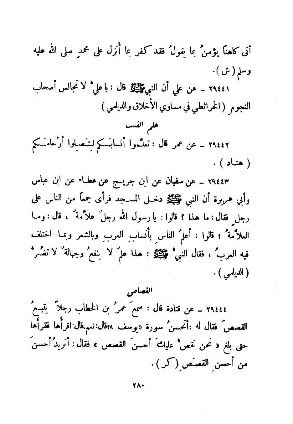 29444- عن قتادة قال: سمع عمر بن الخطاب رجلا يتبع القصص فقال له: أتحسن سورة "يوسف"؟ قال: نعم، قال: اقرأها فقرأها حتى بلغ "نحن نقص عليك أحسن القصص" فقال: أتريد أحسن من أحسن القصص. "كر".