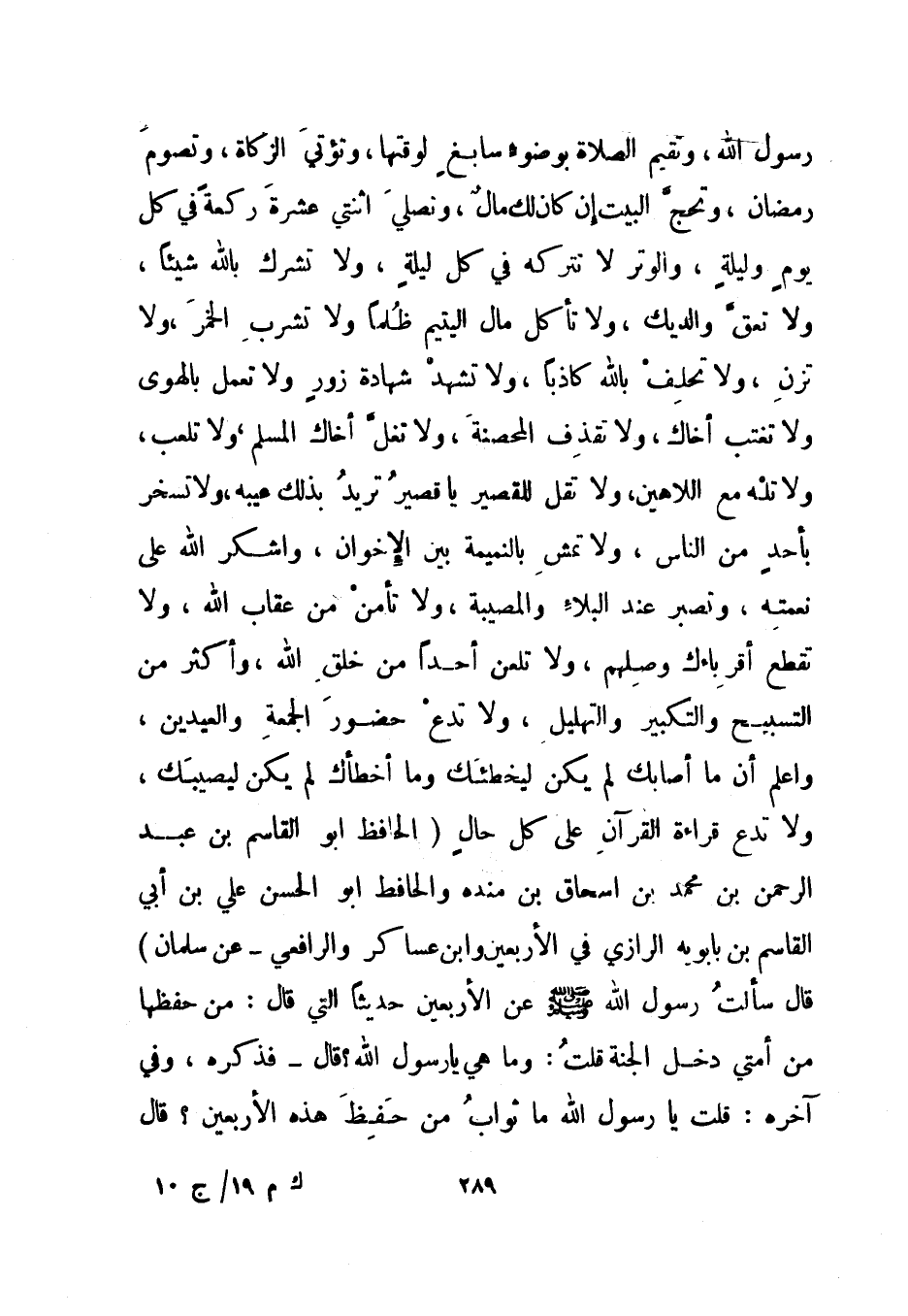 رسول الله، وتقيم الصلاة بوضوء سابغ لوقتها، وتؤتي الزكاة، وتصوم رمضان، وتحج البيت إن كان لك مال، وتصلي اثنتي عشرة ركعة في كل يوم وليلة، والوتر لا تتركه في كل ليلة، ولا تشرك بالله شيئا، ولا تعق والديك، ولا تأكل مال اليتيم ظلما ولا تشرب الخمر، ولا تزن، ولا تحلف بالله كاذبا، ولا تشهد شهادة زور ولا تعمل بالهوى ولا تغتب أخاك، ولا تقذف المحصنة، ولا تغل أخاك المسلم، ولا تلعب، ولا تله مع اللاهين، ولا تقل للقصير يا قصير تريد بذلك عيبه، ولا تسخر بأحد من الناس، ولا تمش بالنميمة بين الإخوان، واشكر الله على نعمته، وتصبر عند البلاء والمصيبة، ولا تأمن من عقاب الله، ولا تقطع أقراباءم وصلهم، ولا تلعن أحدا من خلق الله، وأكثر من التسبيح والتكبير والتهليل، ولا تدع حضور الجمعة والعيدين، واعلم أن ما أصابك لم يكن ليخطئك وما أخطأك لم يكن ليصيبك، ولا تدع قراءة القرآن على كل حال". الحافظ أبو القاسم بن عبد الرحمن بن محمد بن إسحاق بن منده والحافظ أبو الحسن علي بن أبي القاسم بن بابويه الرازي في الأربعين وابن عساكر والرافعي - عن سلمان قال سألت رسول الله صلى الله عليه وسلم عن الأربعين حديثا التي قال: "من حفظها من أمتي دخل الجنة" قلت: وما هي يا رسول الله؟ قال - فذكره، وفي آخره: قلت: يا رسول الله ما ثواب من حفظ هذه الأربعين؟ قال
