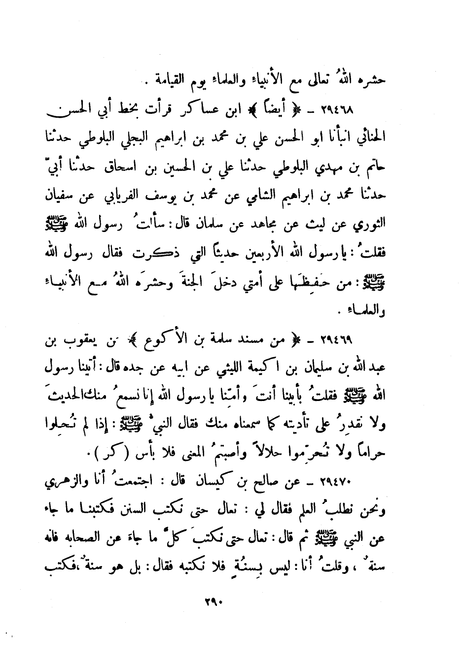29470- عن صالح بن كيسان قال: اجتمعت أنا والزهري ونحن نطلب العلم فقال لي: تعال حتى نكتب السنن فكتبنا ما جاء عن النبي صلى الله عليه وسلم ثم قال: تعال حتى نكتب كل ماجاء عن الصحابة فإنه سنة، وقلت أنا: ليس بسنة فلا نكتبه فقال: بل هو سنة، فكتب