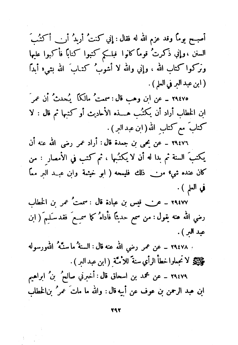 29475- عن ابن وهب قال: سمعت مالكا يحدث أن عمر بن الخطاب أراد أن يكتب هذه الأحاديث أو كتبها ثم قال: لا كتاب مع كتاب الله. ابن عبد البر.