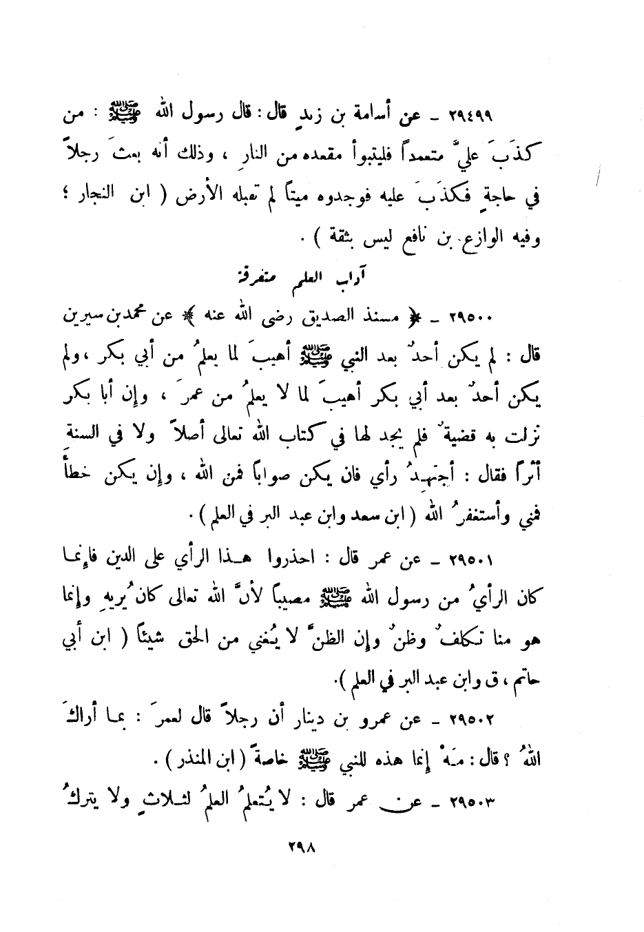 29501- عن عمر قال: احذروا هذا الرأي على الدين فإنما كان الرأي من رسول الله صلى الله عليه وسلم مصيبا لأن الله تعالى كان يريه وإنما هو منا تكلف وظن وإن الظن لا يغني من الحق شيئا. ابن أبي حاتم، "ق" وابن عبد البر في العلم.
