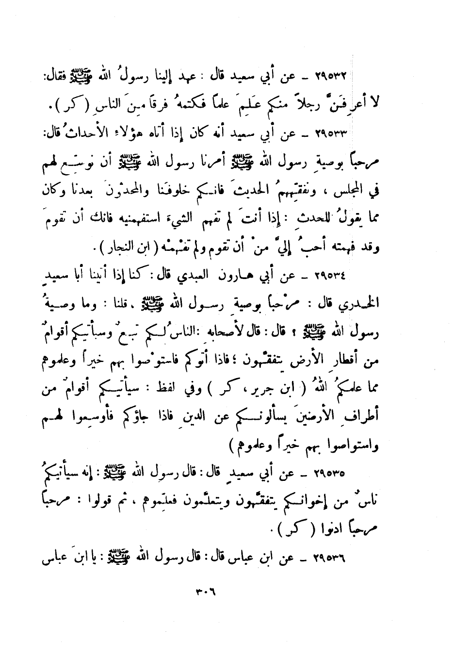 29534- عن أبي هارون العبدي قال: كنا إذا أتينا أبا سعيد الخدري قال: مرحبا بوصية رسول الله صلى الله عليه وسلم، قلنا: وما وصية رسول الله صلى الله عليه وسلم؟ قال: قال لأصحابه: "الناس لكم تبع وسيأتيكم أقوام من أقطار الأرض يتفقهون؛ فإذا أتوكم فاستوصوا بهم خيرا وعلموهم مما علمكم الله". ابن جرير، "كر" وفي لفظ: "سيأتيكم أقوام من أطراف الأرضين يسألونكم عن الدين فإذا جاؤوكم فأوسعوا لهم واستوصوا بهم خيرا وعلموهم".