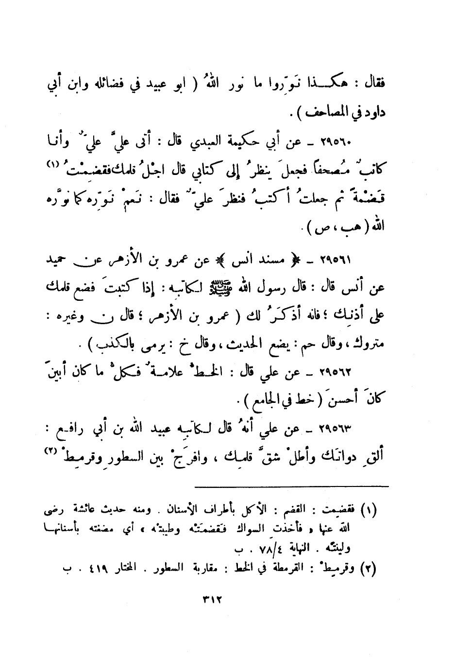29560- عن أبي حكيمة العبدي قال: أتى علي علي وأنا كاتب مصحفا فجعل ينظر إلى كتابي قال: اجل قلمك فقضمت1 قضمة ثم جعلت أكتب فنظر علي فقال: نعم نوره كما نوره الله. "هب، ص".