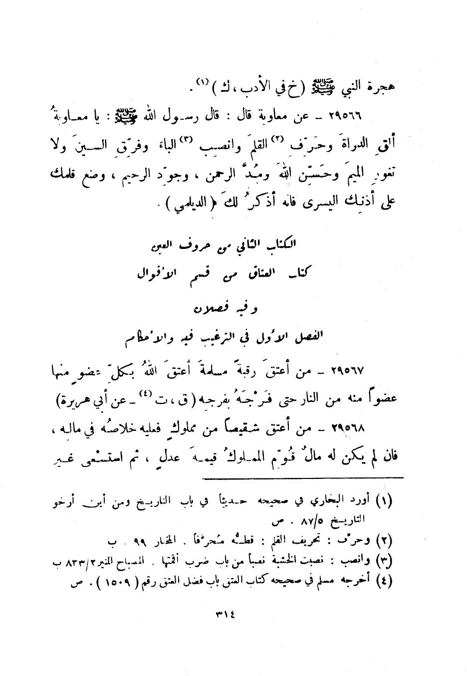 29567- "من أعتق رقبة مسلمة أعتق الله بكل عضو منها عضوا منه من النار حتى فرجه بفرجه"."ق، ت"4 عن أبي هريرة.