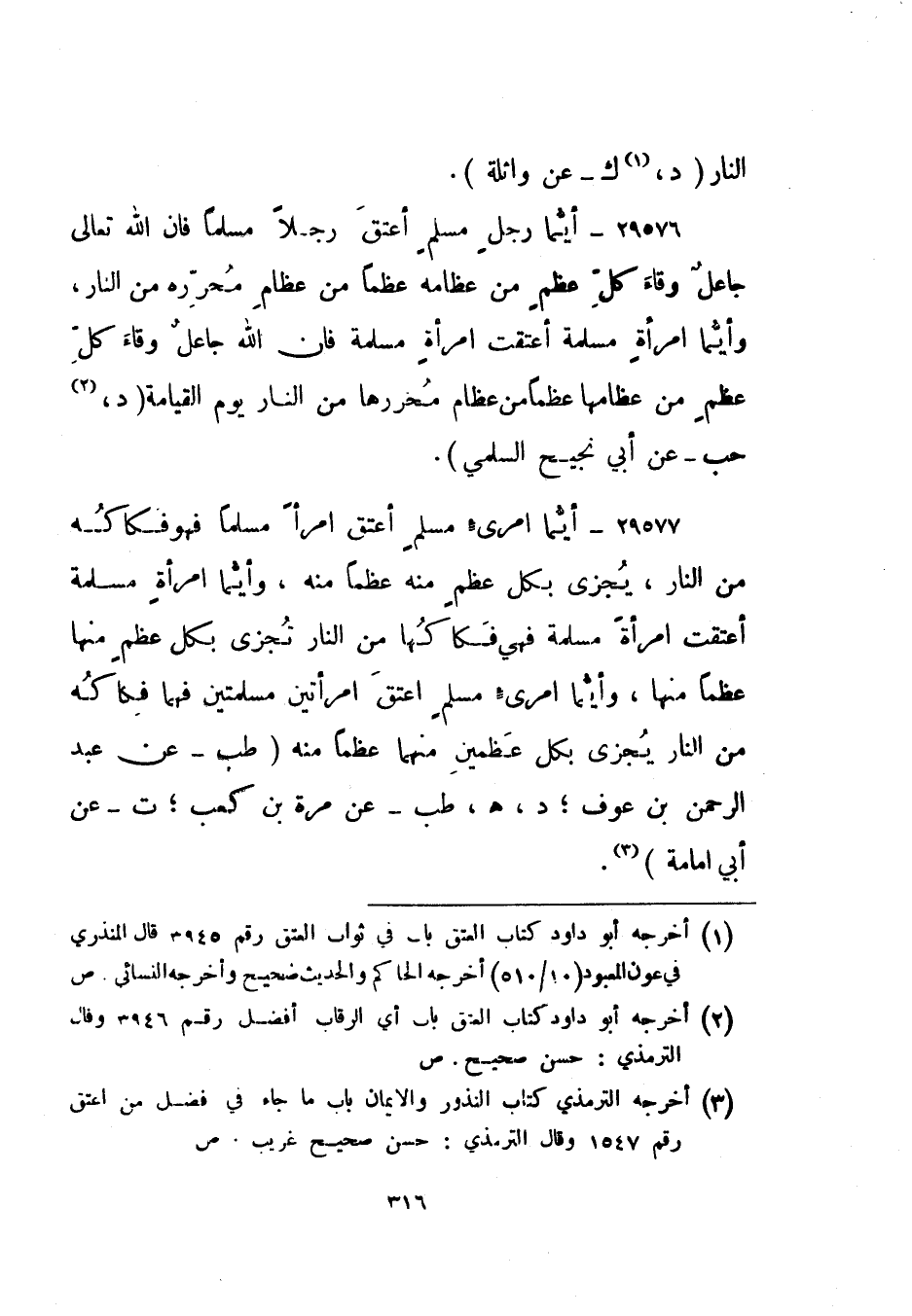 29577- "أيما امرئ مسلم أعتق امرأ مسلما فهو فكاكه من النار، يجزي بكل عظم منه عظما منه، وأيما امرأة مسلمة أعتقت امرأة مسلمة فهي فكاكها من النار تجزى بكل عظم منها عظما منها، وأيما امرئ مسلم أعتق امرأتين مسلمتين فهما فكاكه من النار يجزى بكل عظمين منهما عظما منه". "طب" عن عبد الرحمن بن عوف؛ "د، هـ، طب" عن مرة بن كعب؛ "ت" عن أبي أمامة3.