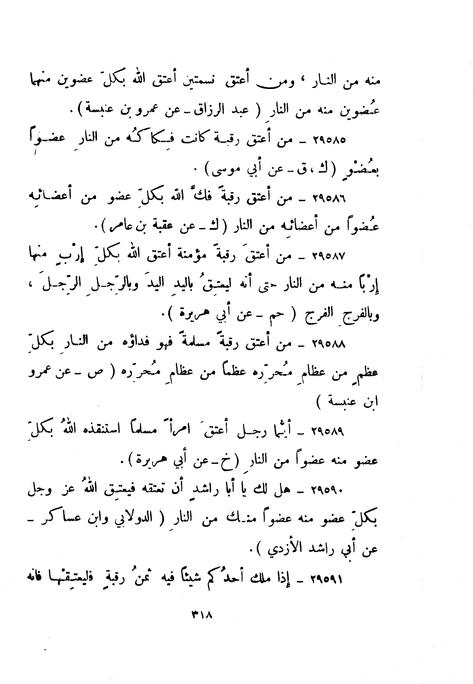 29587- "من أعتق رقبة مؤمنة أعتق الله بكل إرب منها إربا منه من النار حتى أنه ليعتق باليد اليد وبالرجل الرجل، وبالفرج الفرج". "حم" عن أبي هريرة.