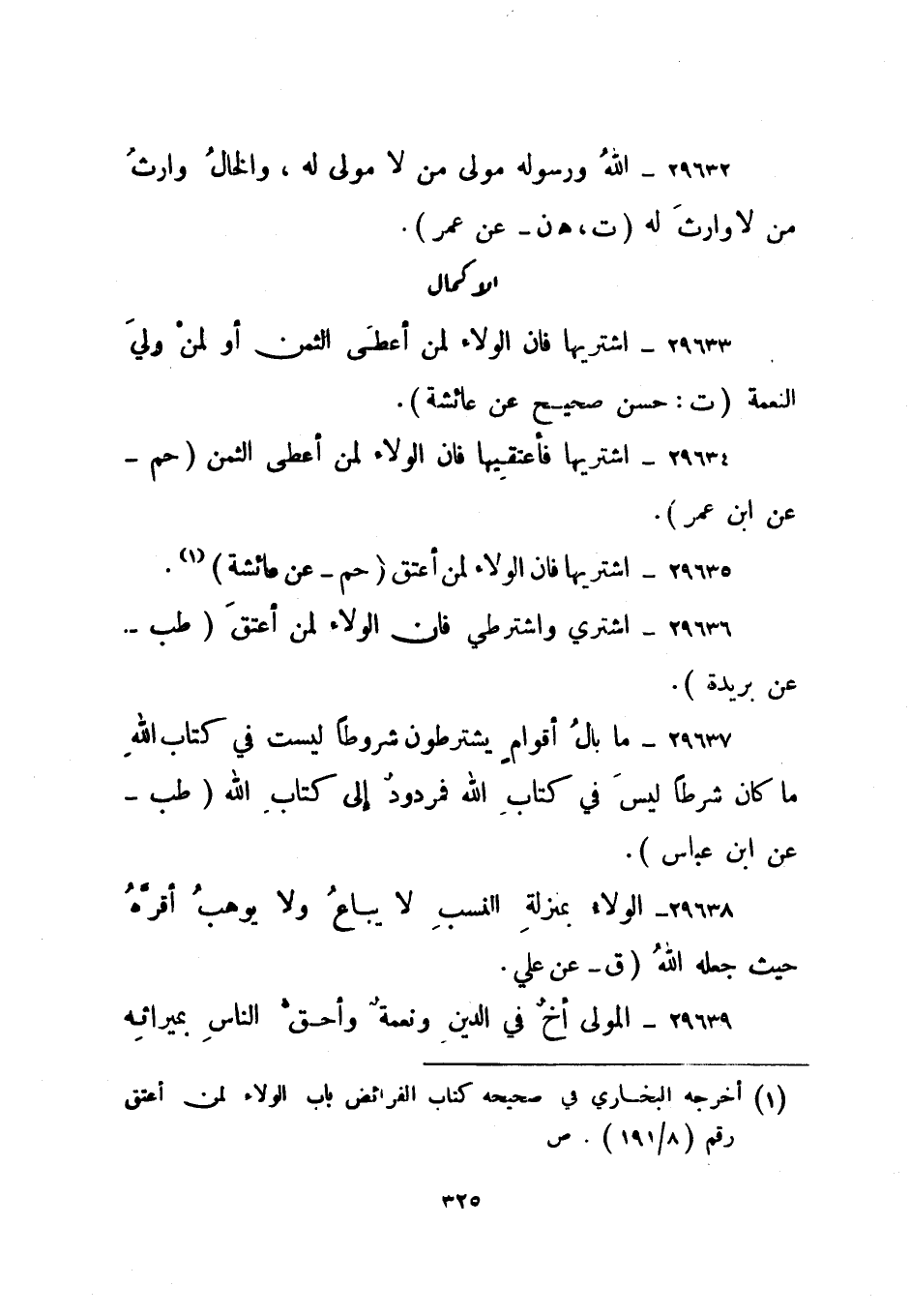 1 أخرجه البخاري في صحيحه كتاب الفرائض باب الولاء لمن أعتق رقم "8/191". ص.