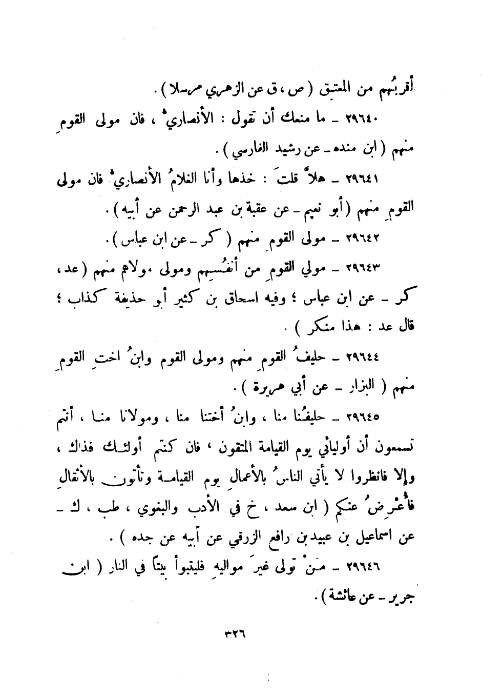 29646- "من تولى غير مواليه فليتبوأ بيتا في النار". ابن جرير - عن عائشة.