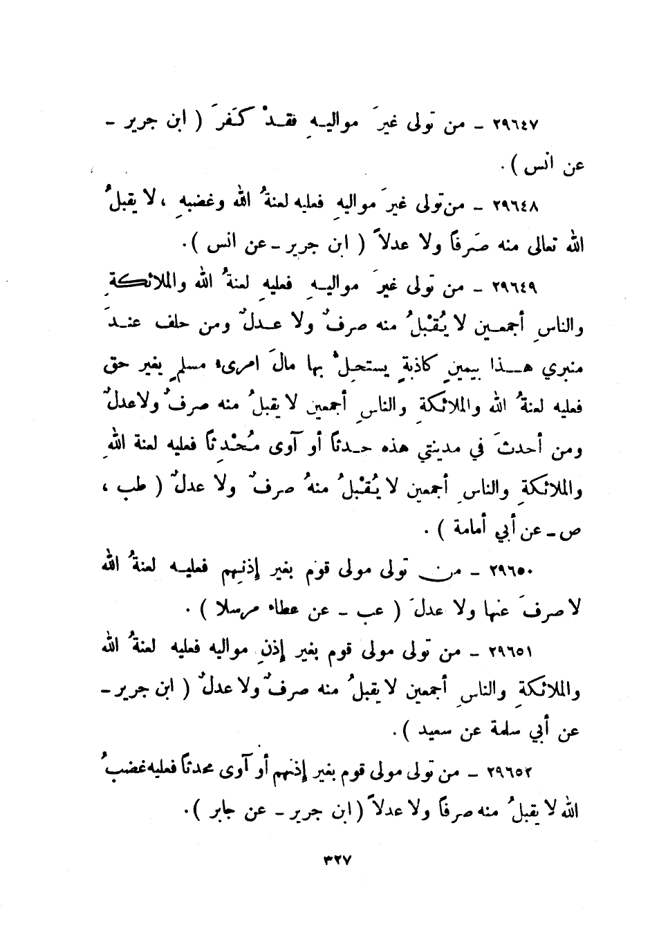 29651- "من تولى مولى قوم بغير إذن مواليه فعليه لعنة الله والملائكة والناس أجمعين لا يقبل منه صرف ولا عدل". ابن جرير - عن أبي سلمة عن سعيد.
