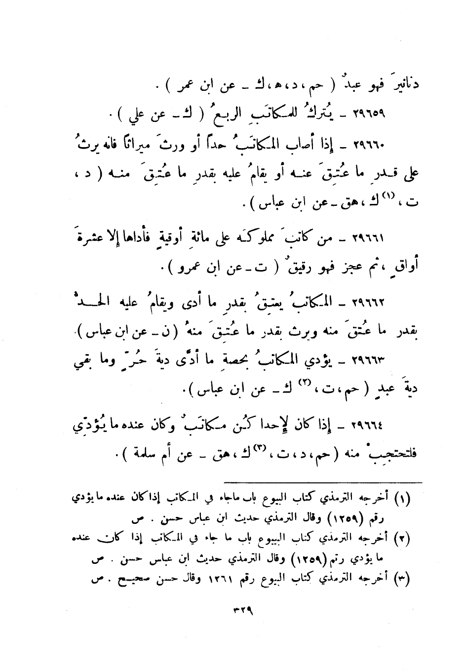 29664- "إذا كان لإحداكن مكاتب وكان عنده ما يؤدي فلتحتجب منه". "حم، د، ت،3 ك، هق" عن أم سلمة.