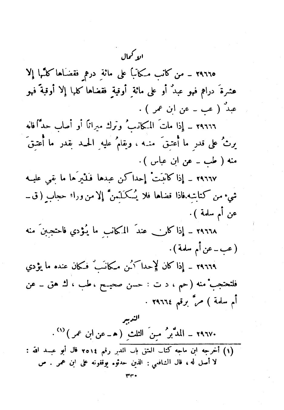 29669- "إذا كان لإحداكن مكاتب فكان عنده ما يؤدي فلتحتجب منه". "حم، د ت": حسن صحيح، "طب، ك هق" عن أم سلمة مر برقم 29664.
